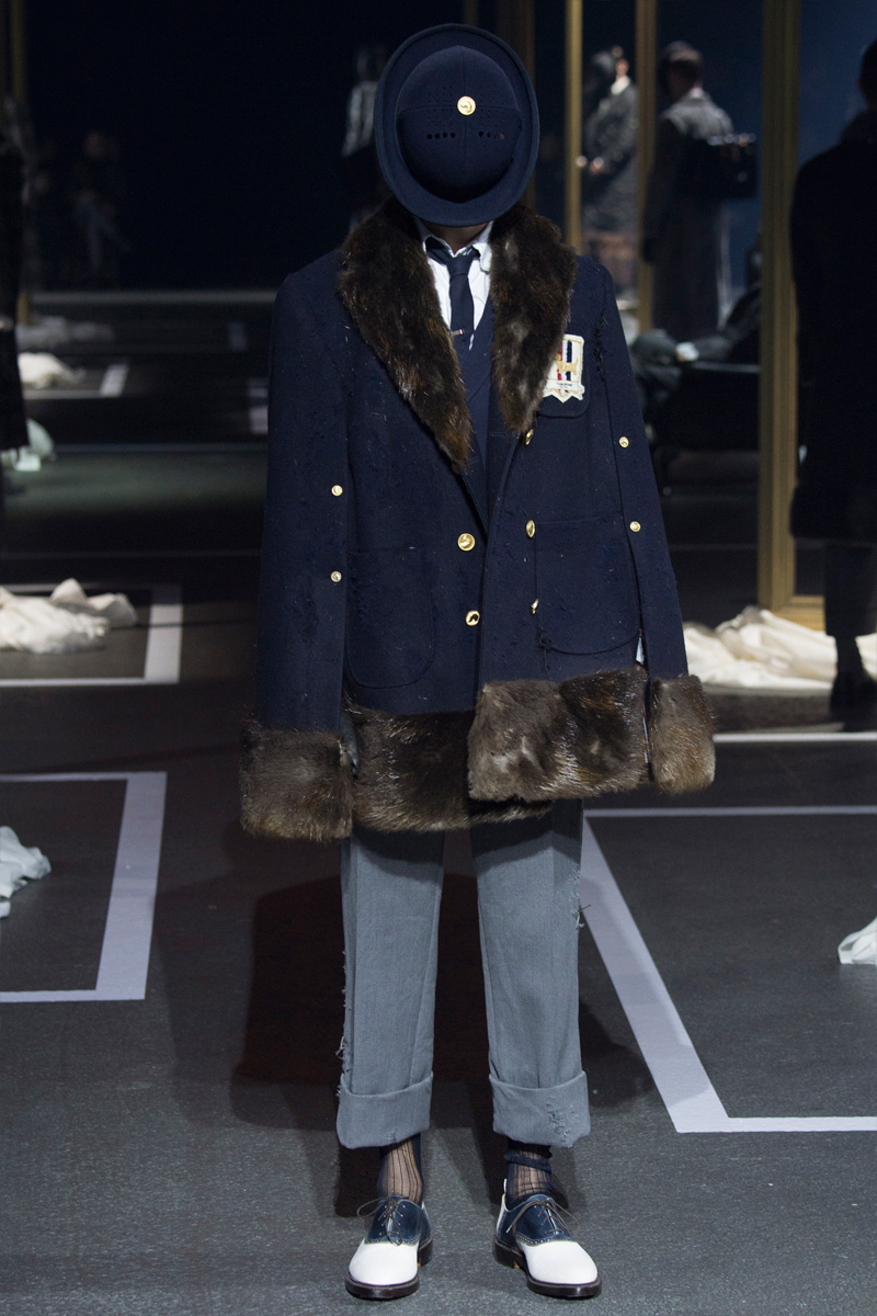 Designer Thom Browne championed quite the tailored narrative for his fall-winter 2016 men’s collection. The American designer imagined a meeting of gentlemen, who lived through the turbulent 1920s, which ended in the Great Depression. Unveiling his collection in sets of three evolving ensembles, each man’s outfit makes the transition from the early 1920s to tattered, depression chic.