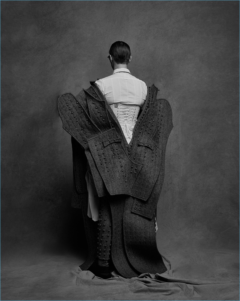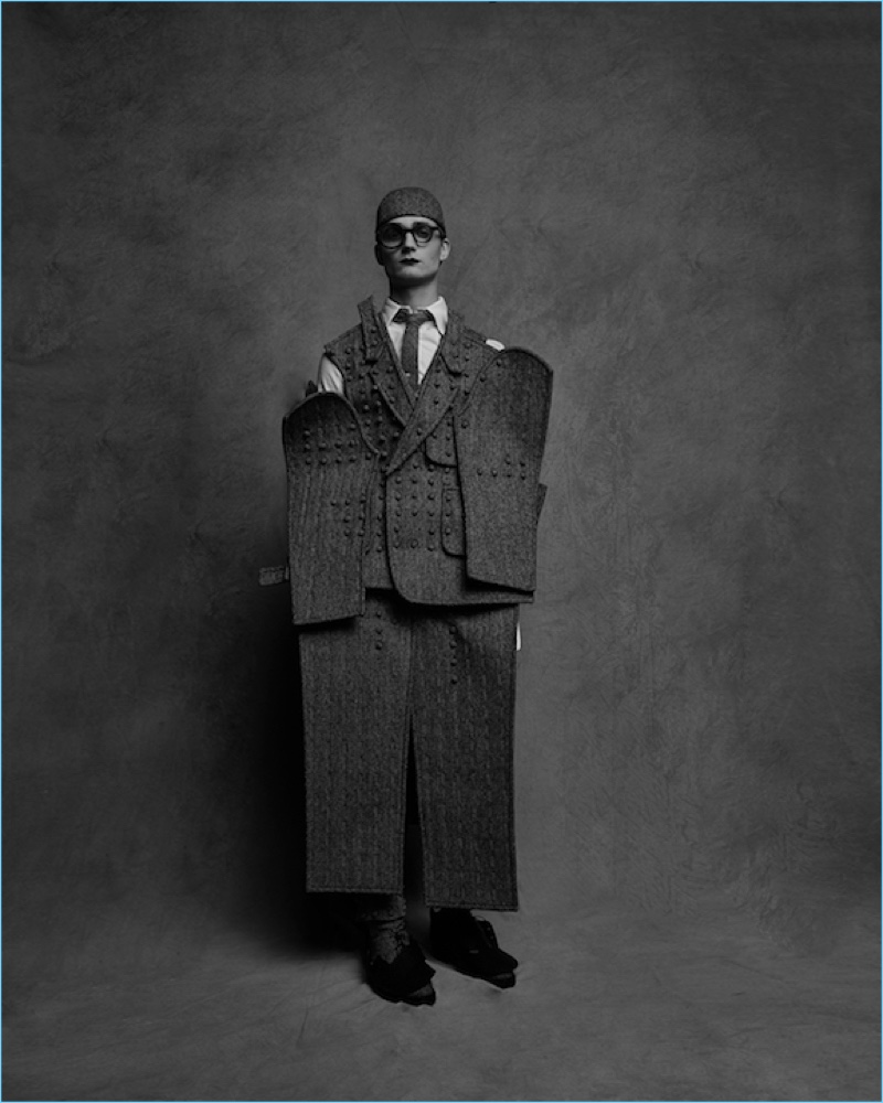 The modest black and white outing easily spotlights Browne’s detailed craftsmanship. The new season shines with a focus on tweed and herringbone. Here, models Hunter Taylor-Martinez, Paul-Alexandre Haubtmann, Julien De Gainza, Thomas Sneesens and more portray the unconventional man of Thom Browne.