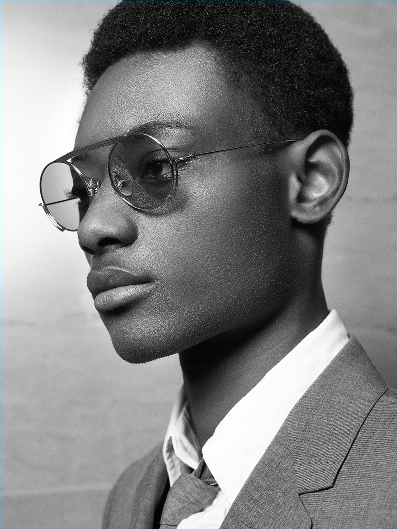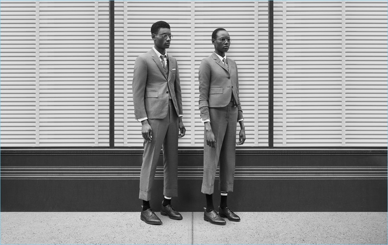 Youssouf Bamba is in the spotlight as he connects with Thom Browne. Photographed by John Juniper, Youssouf steps out in a smart fall-winter 2018 uniform by the American label. Showcasing the unisex appeal of Thom Browne, Youssouf joins model Ajak Deng. Together, the pair dons tailored grey essentials. The signature Thom Browne wardrobe includes shrunken suit pieces in grey, striped mid-calf socks, and classic brogue shoes.