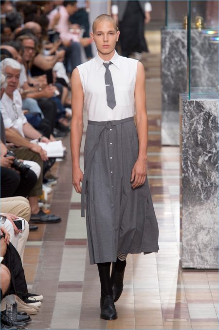 Although, Thom Browne may be one of the best when it comes to modern tailoring, the American designer doesn’t shy away from breaking with convention. Approaching his spring-summer 2018 collection, Browne dials it back on trousers and opts for skirts. Short or long, pleated skirts join a line up of shrunken suit jackets, crisp shirts, and skinny ties. Showcasing his sartorial spin on the skirt, it only seems right that Browne puts the models in a heeled version of the oxford shoe. Meanwhile, the models also share a similar hairstyle with Browne. Now the question is, ‘When can we see Browne in one of these looks?’
