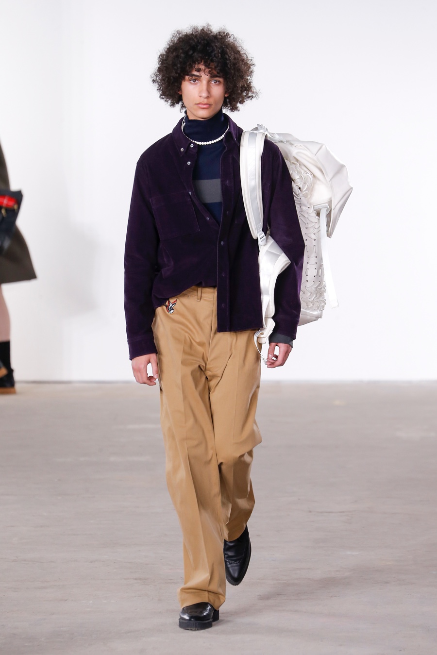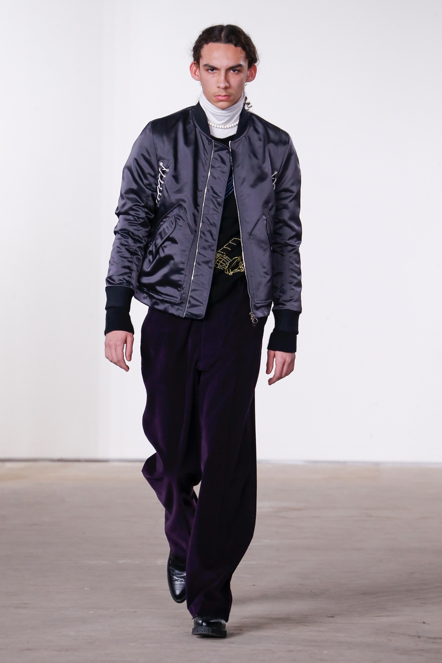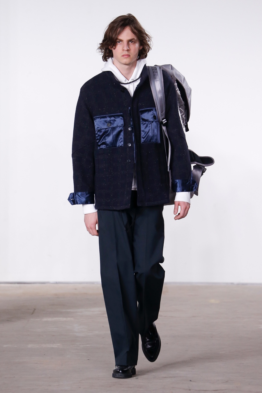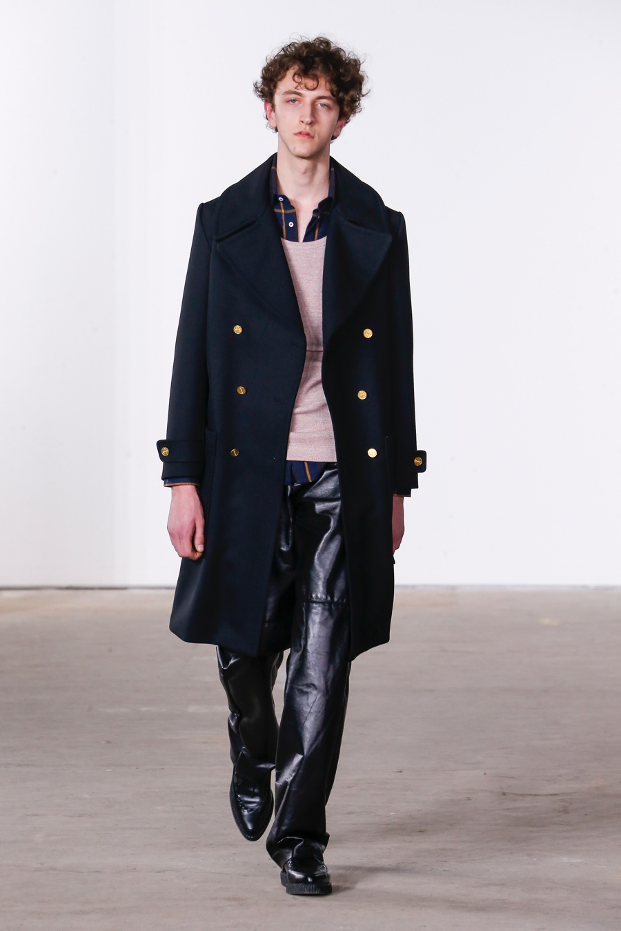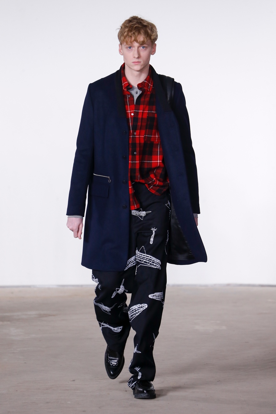 Married with western accents and space-related artwork, the collection unveiled a fun wardrobe of contemporary fashions. Among Coppens’ signature joggers, parkas and bomber jackets, tartan trousers, sherpa bonded denim and shadow plaid jersey were introduced. Hero pieces of the season included long military coats, voluminous pleated trousers, light plaid outerwear and graphic pullovers.