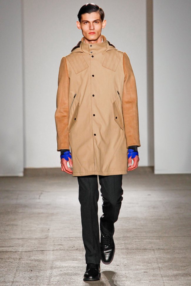 The Active Uniform–Treading a fine path for the fall/winter 2012 season, Tim Coppens turns to the film Drive for inspiration. Filtering menswear fundamentals through a course, associated with racing and hockey, tailoring is relaxed and moods varied. Optioning fitted trousers and a more laidback silhouette, found in jogging pants, casual and formal identities coexist. The grounding force to knitwear and jackets, a sporty aesthetic is adapted for Coppen’s new uniform. Sleeves are zippered, leather insets embraced and strong lines incorporated for a detailed finish to an evolving season.