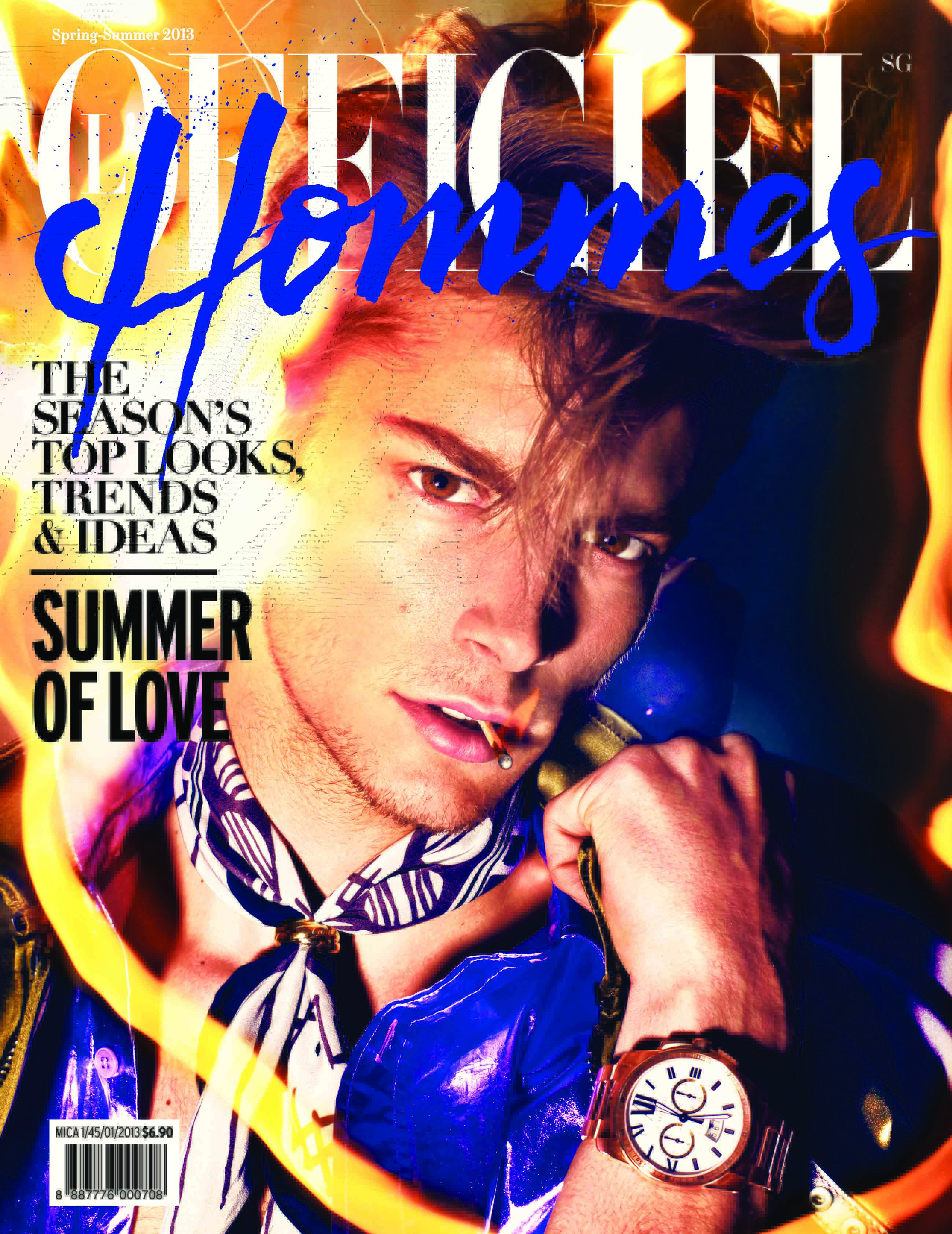 High Saturation–Spring 2013 runs for the most colorful season in a while, as demonstrated by the many vibrant colors used by so many labels for their spring collections. The last proof of this trend is the spring/summer 2013 cover of L’Officiel Hommes Singapore, lensed by Chuando & Frey, starring AVE Management model Timothée Bertoni. Styled by Jack Wang and Jumius Wong in a bright blue shirt, paired with a blue and white printed scarf and a luxury watch, Timothée definitely embodies this season’s freshness and lends his charming visage for this striking cover. / Hair by Rick Yang and Gary Low. Makeup by Rick Yang and Seksan.