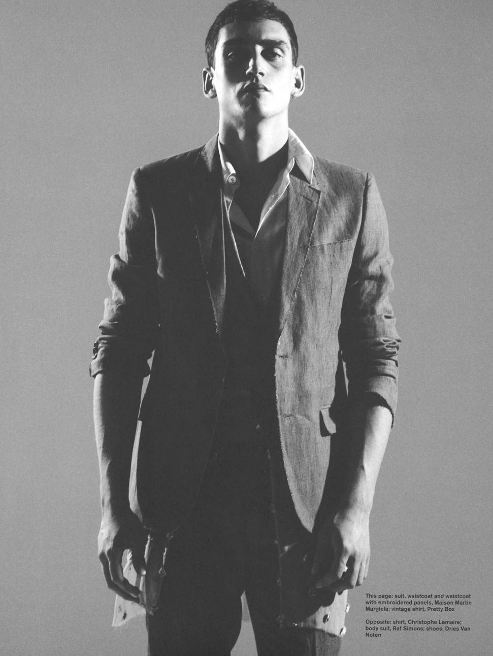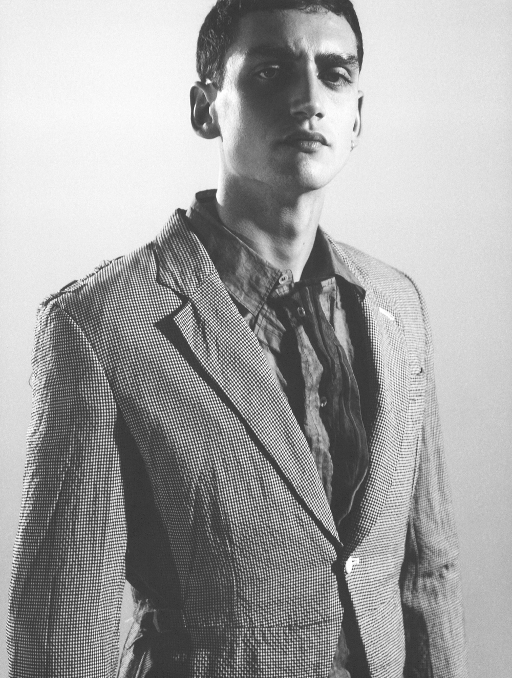 Each is Welcome to His Voice-Bananas model Timothée Elkaim hits the photo studio for a new black & white story from Dapper Dan. Exuding a quiet confidence, Timothée is in top form as he wears tailored pieces for a smart spring piece with charm. Photographed by Vassilis Karidis with styling by Nicholas Georgiou, Timothée is captured in fashions from labels that include Martin Maison Margiela and Dries Van Noten.