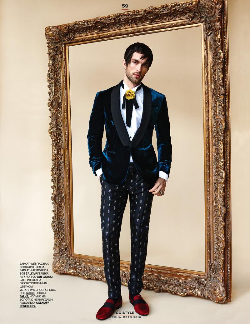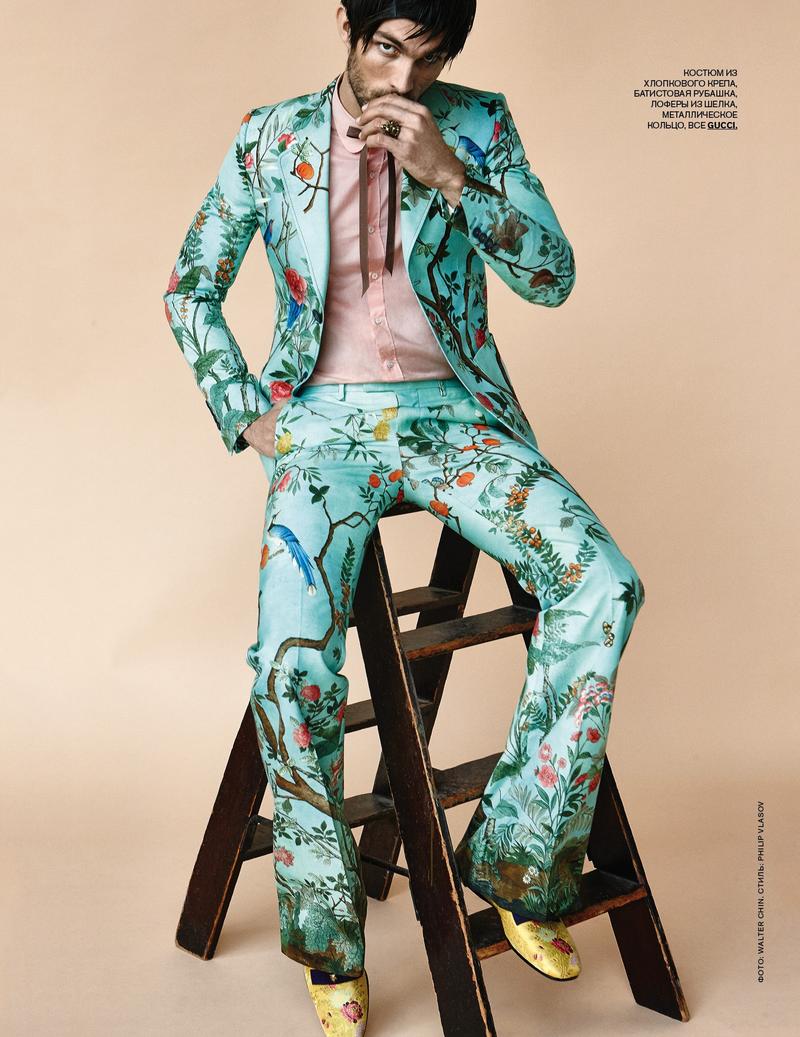 Tobias Sorensen graces the cover of GQ Style Russia’s spring-summer 2016 issue. Starring in quite the editorial, the Danish model is photographed by Walter Chin. Sporting a razor sharp hairstyle, Tobias is groomed by Joey George and styled by Philip Vlasov. Touching upon fashionable dandy moments, Tobias is captured in standouts such as Bally’s velvet dinner jacket and Gucci’s patterned spring suiting.