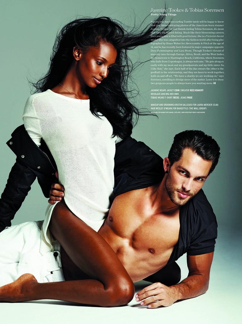 Two of a Kind–After gracing the pages of Vogue US, appearing alongside his girlfriend, model Jasmine Tookes, Danish model Tobias Sørensen appears before the lens of Philippe Vogelenzang for another couple portrait, published in the latest issue of V Magazine. Styled by Brandon Maxwell in optical white jeans and a basic black tee, Tobias definitely enjoys to spend some extra time with his girlfriend in front of the camera. / Grooming by Kristin Gallegos.