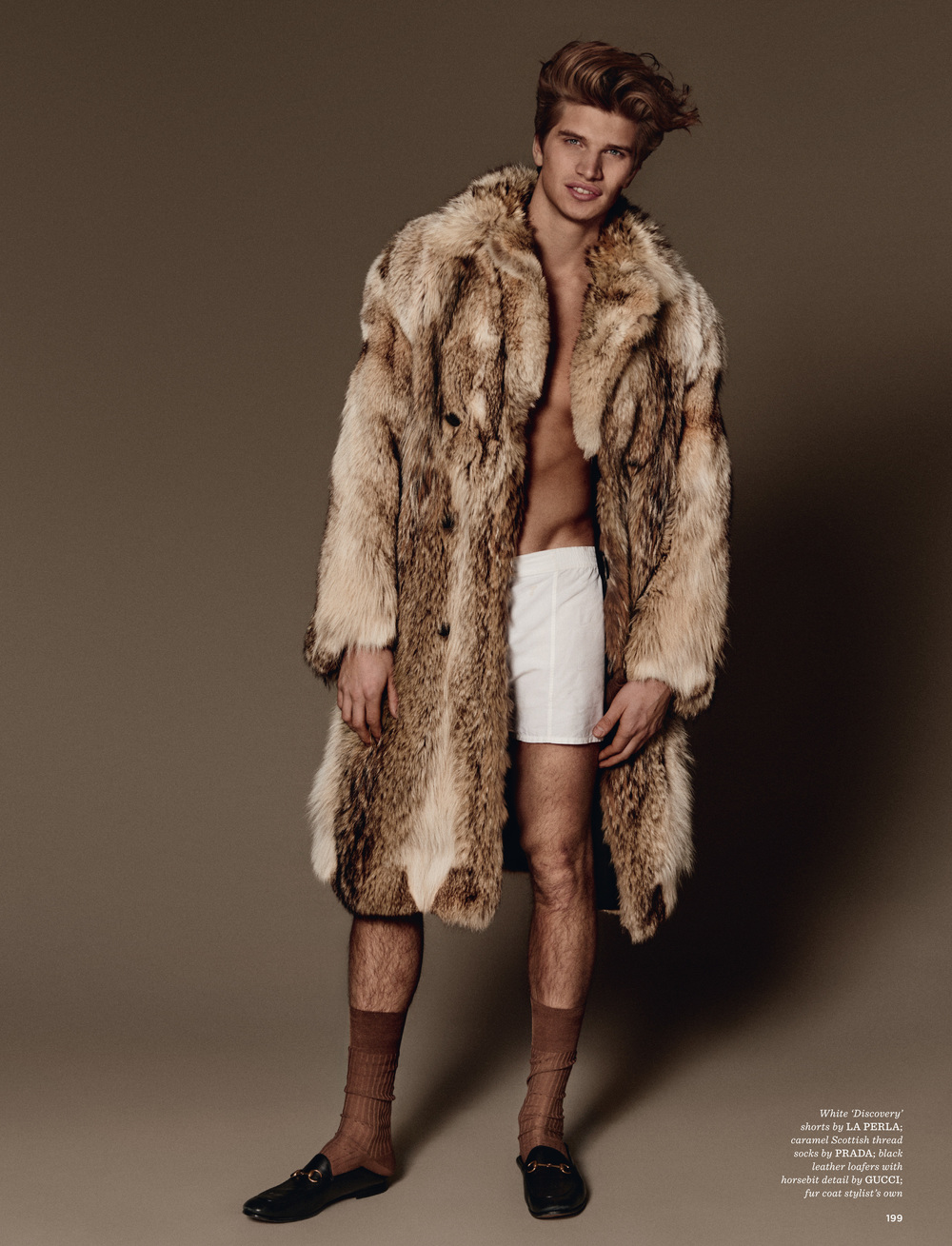 Styled by Luke Day, Toby Huntington-Whiteley dons an extravagant fur coat for British GQ Style.