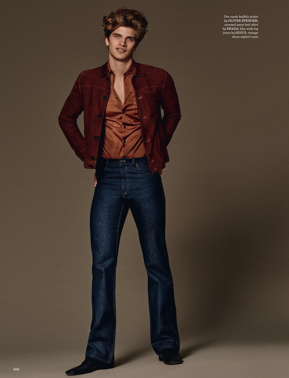 Toby Huntington-Whiteley channels the 1970s in Oliver Spencer, Prada and Gucci.
