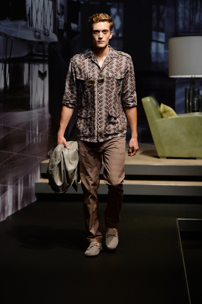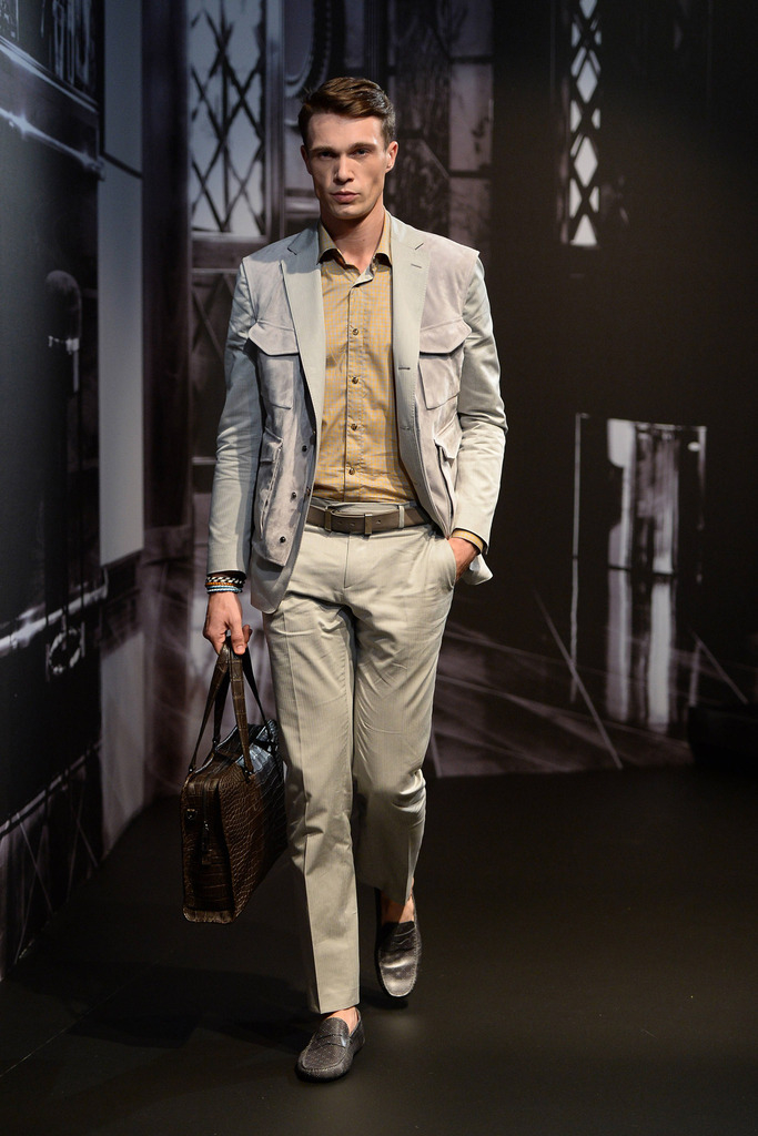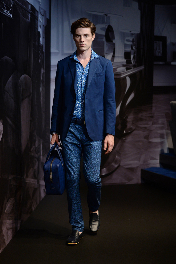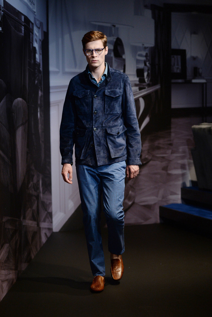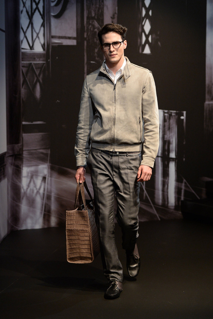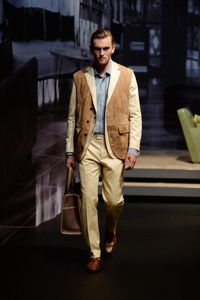 Tod’s Spring/Summer 2015–New Tod’s creative director Andrea Incontri collaborated with the label’s design team for spring/summer 2015. Tod’s, famous for its driving shoes, introduced a timeless range of clothes for its sophisticated man of the world. Silhouettes were tailored as separates came out in hues of blue and brown. Jackets with field pockets, double-breasted blazers worn unbuttoned, loose printed button-downs, trim pleated trousers and suede jackets contributed to an easily accessible debut outing from Incontri.