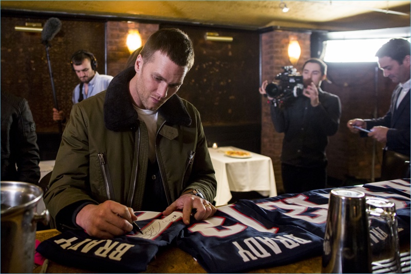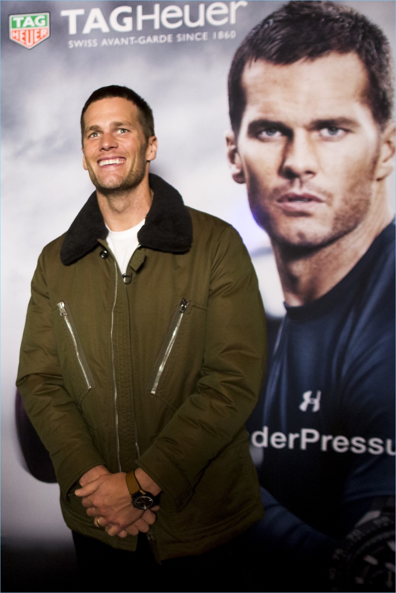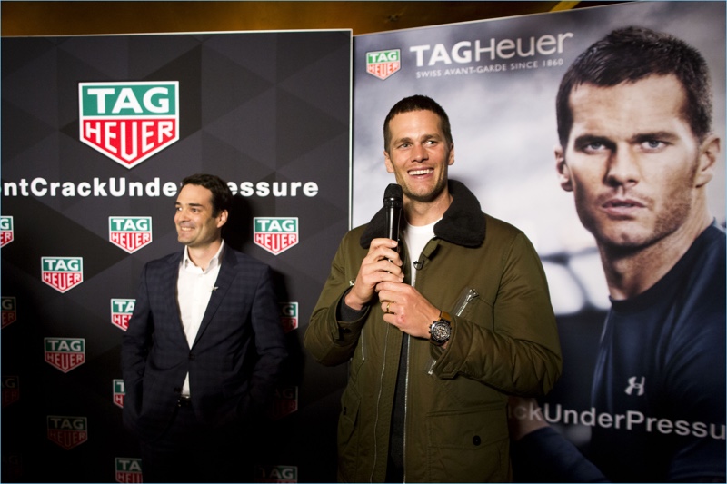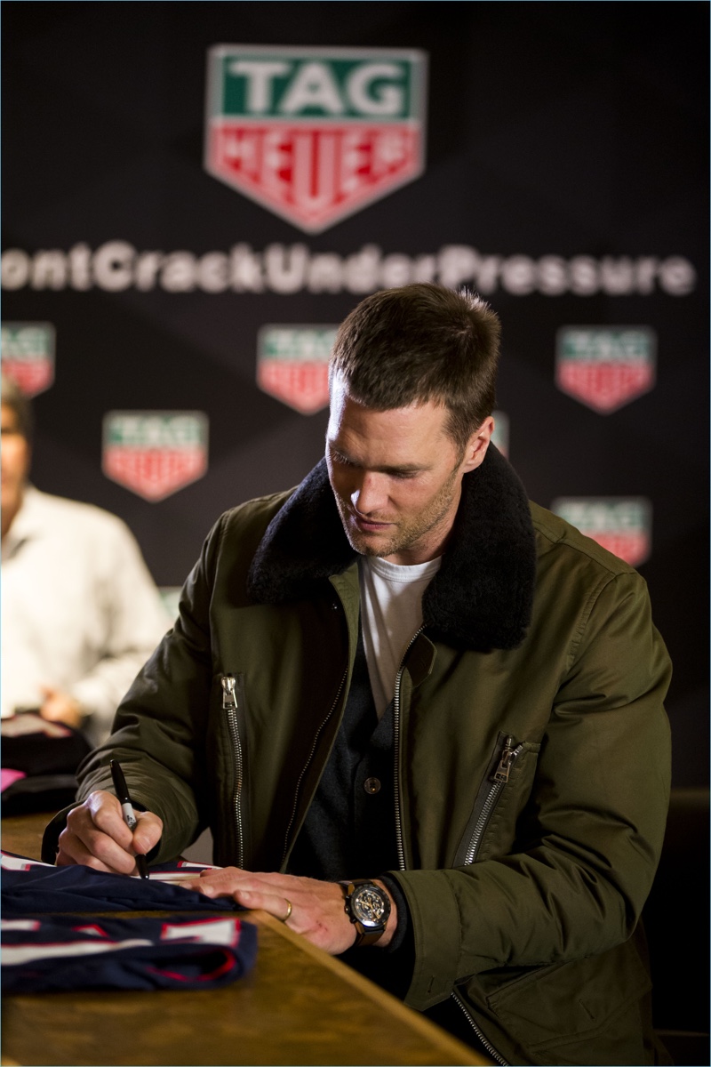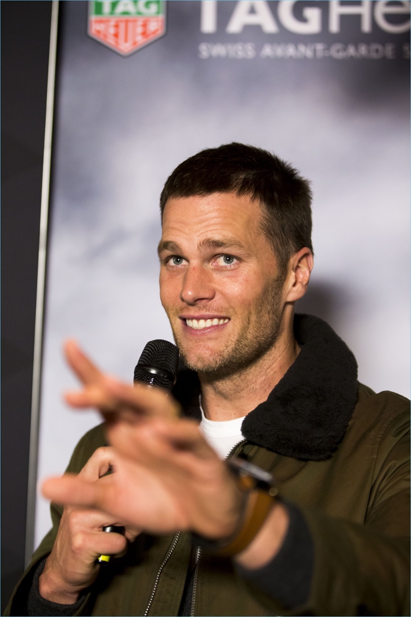 The TAG Heur brand ambassador also found time to celebrate in Boston with the company. Brady went casual for the occasion, rocking a bomber over a simple tee and cardigan sweater. TAG Heuer surprised Brady with a customized Carrera Heuer 02 Tourbillon watch with “5 Championships” engraved on the case back.