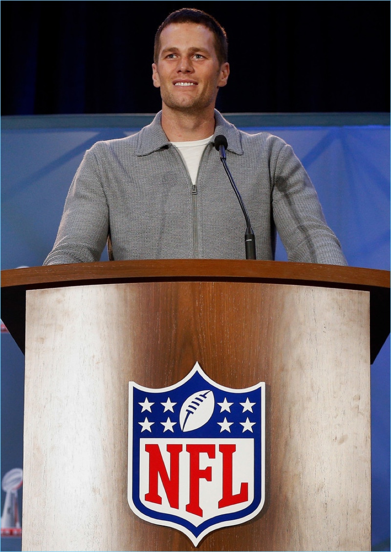 Tom Brady was all smiles on February 6, 2017 as he celebrated his fifth Super Bowl win at a winner and MVP conference in Houston, Texas. The New England Patriots quarterback donned a full-zip grey wool cardigan sweater by Tom Ford.