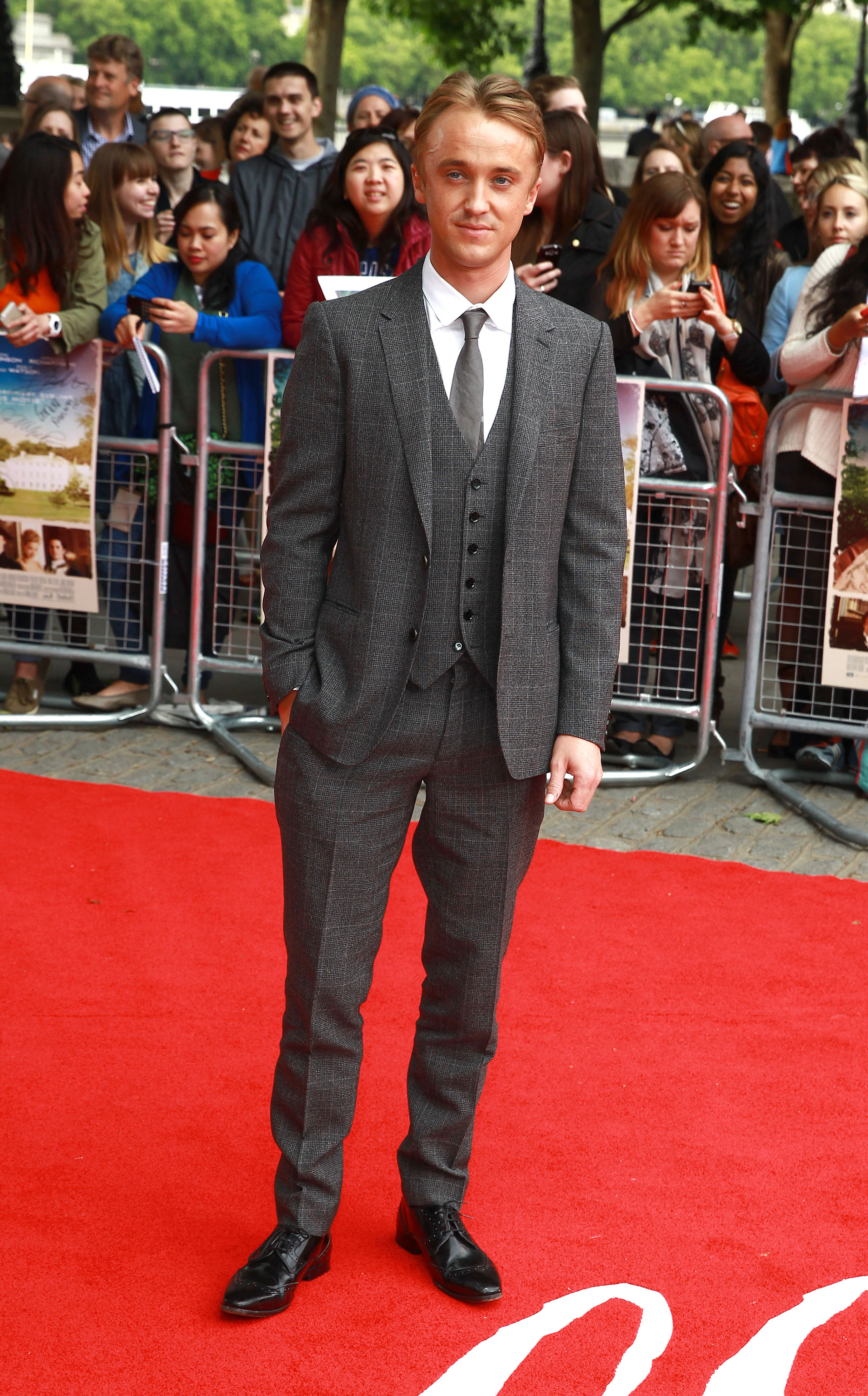 Burberry Trio-Wearing Burberry Tailoring to the UK premiere of Belle at BFI Southbank, actors Tom Felton, Sam Reid and James Norton made a strong sartorial impression. Demonstrating how far a great suit can go, Felton wore a three-piece number in a prince of wales check while Reid simply charmed in a grand blue. Meanwhile, Norton kept things sleek in charcoal.