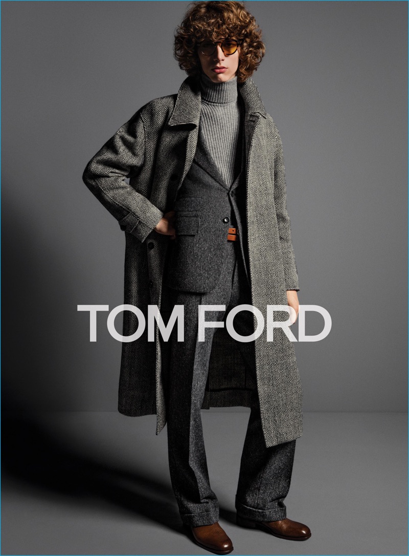Erik van Gils dons relaxed tailoring and a turtleneck sweater for Tom Ford’s fall-winter 2016 menswear campaign.