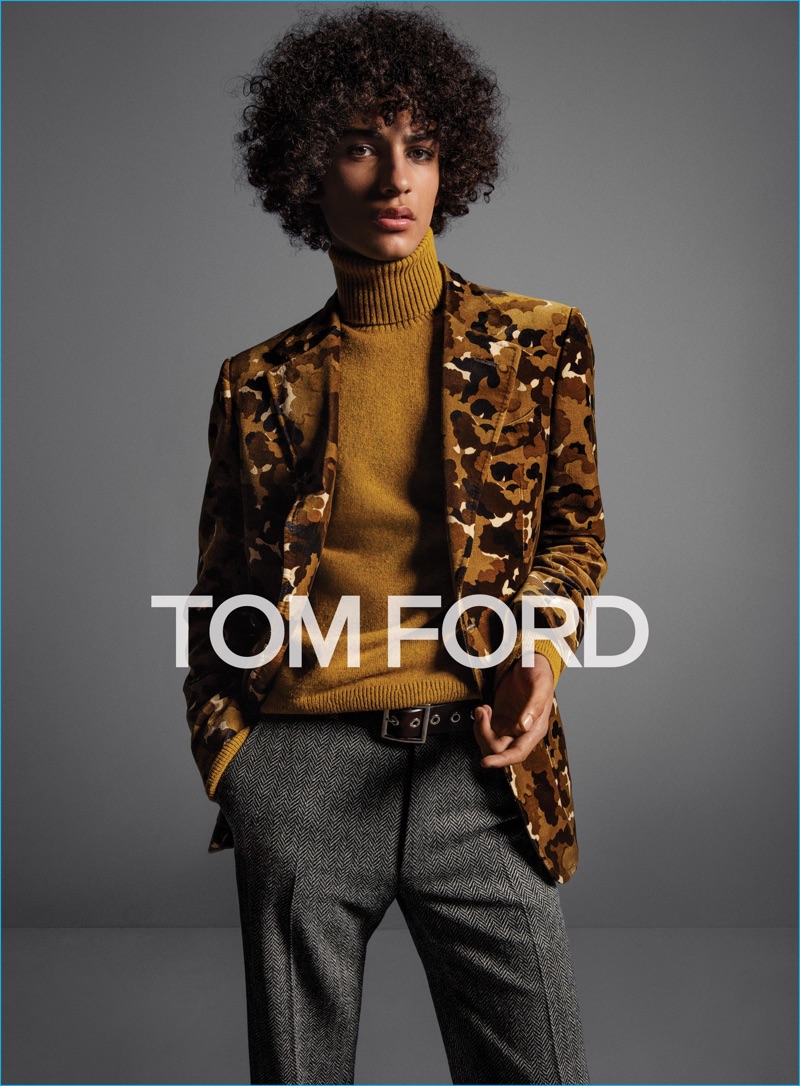 Tre Samuels channels 70s style in a chic turtleneck sweater and camouflage print blazer for Tom Ford’s fall-winter 2016 menswear campaign.