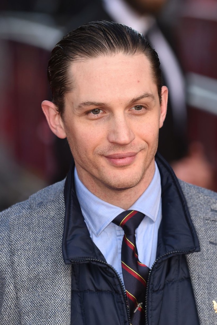 Hardy is Slick-Attending the world premiere of his latest film Locke, British actor Tom Hardy stepped out with a sleek groomed look, elevated by a slicked back coif. Embracing a workerswear look for the Birmingham premiere, Hardy paired a quilted jacket with a tweed blazer, relaxed trousers and a smart shirt and tie combo. Hardy also appears on the latest cover of Esquire.