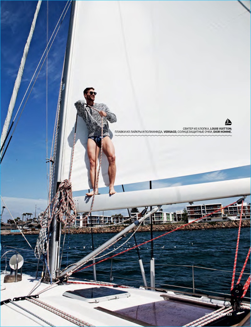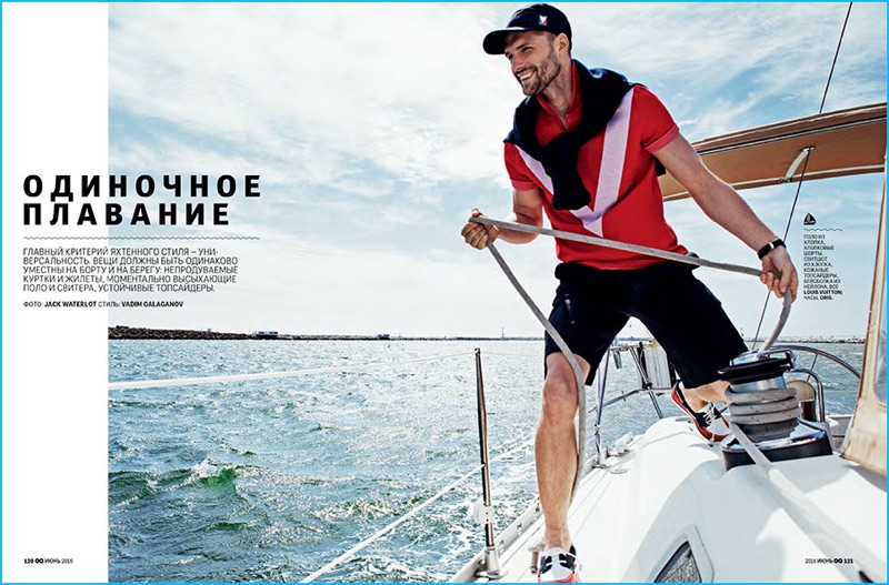 Tomas Skoloudik takes to the open sea for a nautical themed story featured in the latest issue of GQ Russia. Sporting active fashions, Tomas is styled by Vadim Galaganov for the fashion editorial.