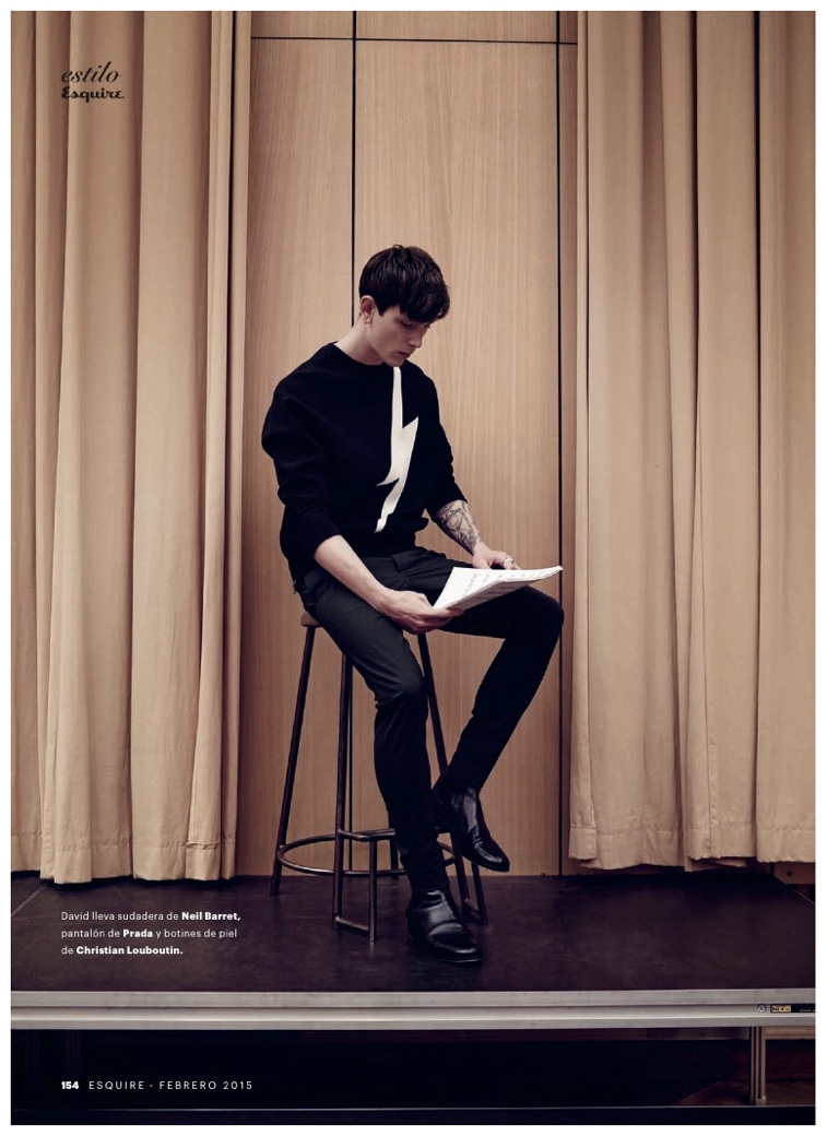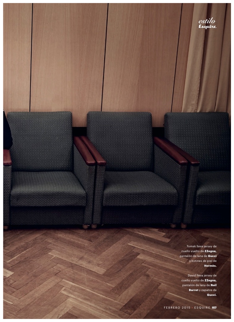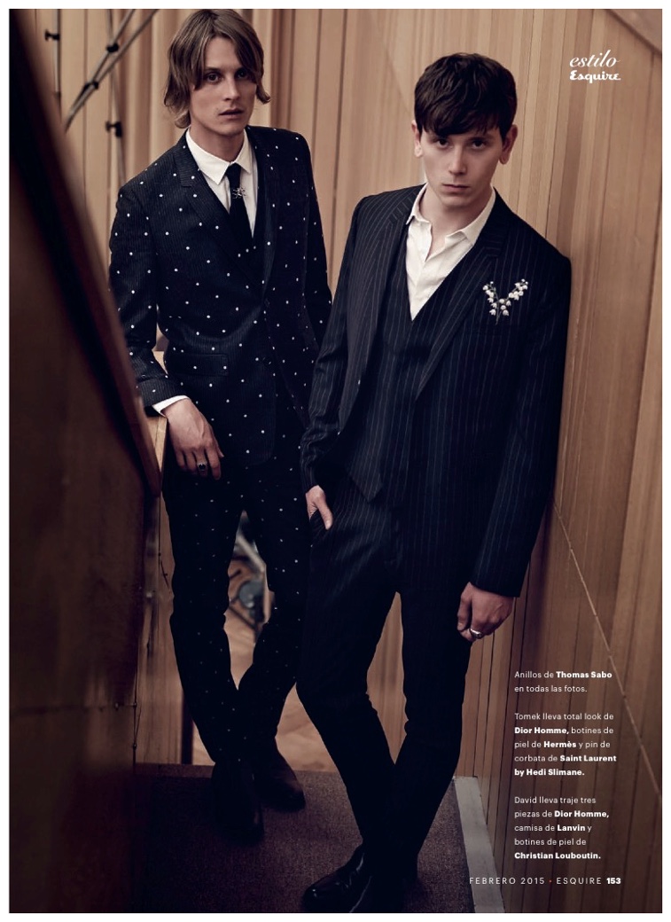 Dressed to impress and photographed by Marcin Tyszka, models Tomek Szczukiecki and David Metcalfe make a new appearance in the February 2015 edition of Esquire España. Outfitted by fashion editor Ildara Cuiñas, the pair keep themselves busy around the set, while donning strong winter pieces from the likes of Dior Homme, Lanvin and Christian Louboutin.