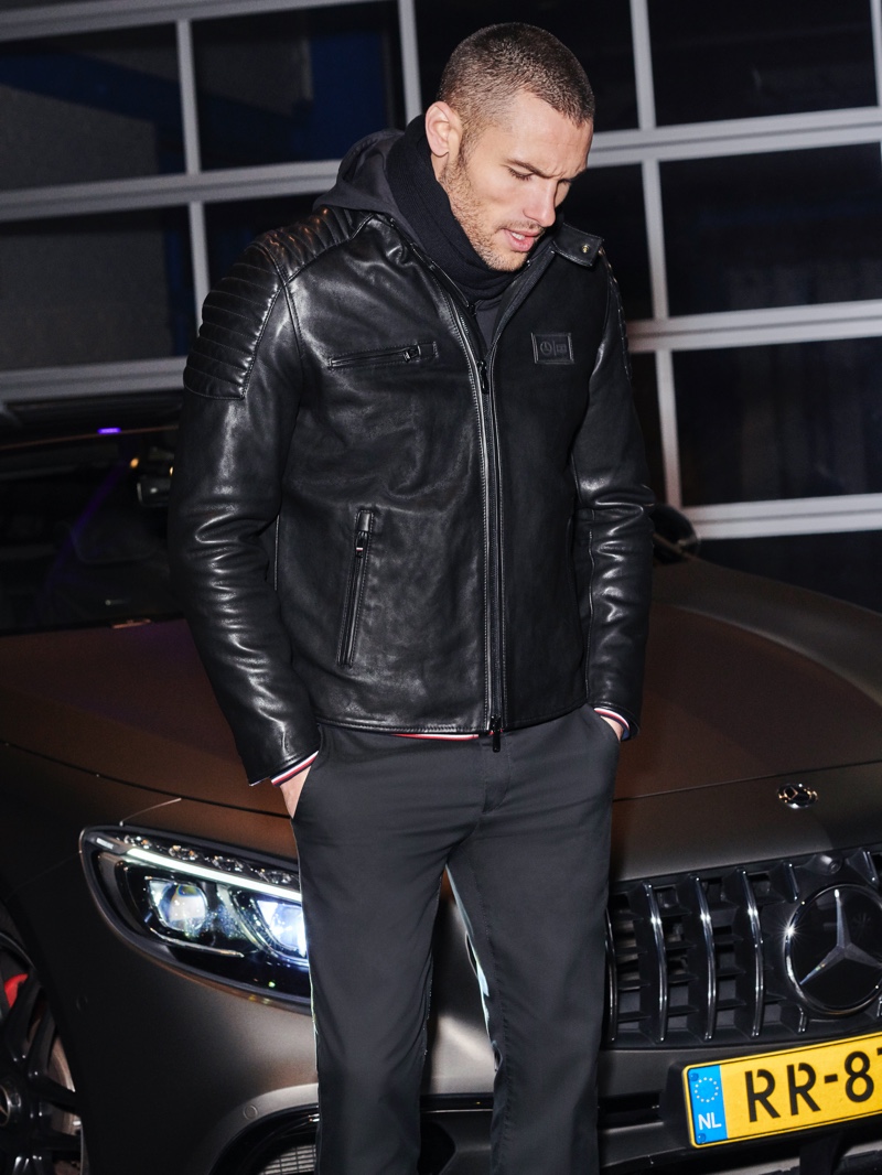 A cool vision, Corey Saucier rocks a leather jacket and full-zip hoodie from the Tommy x Mercedes-Benz fall-winter 2019 collection.