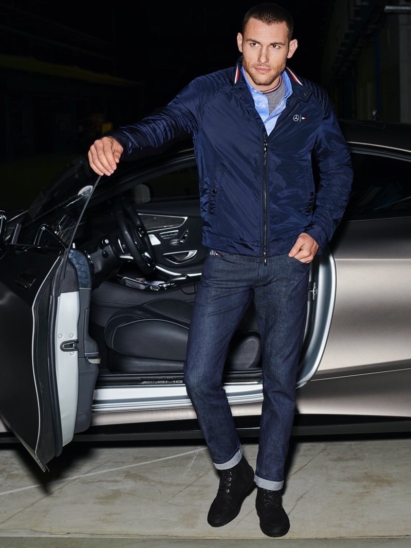Tommy Hilfiger collaborates with Mercedes-Benz once more, resulting in the second TommyxMercedes-Benz capsule collection. Hilfiger’s iconic take on American sportswear comes together with the innovative spirit of Mercedes-AMG Petronas Motorsport for a sharp collection. The capsule campaign embraces a cinematic quality as model Corey Saucier takes the lead. He poses alongside the S63 AMG Mercedes Coupe. Sporting a blue, red, and white wardrobe, Corey wears must-have pieces like a car coat or cafe racer jacket.