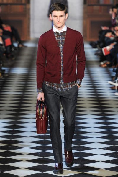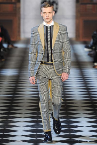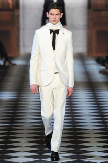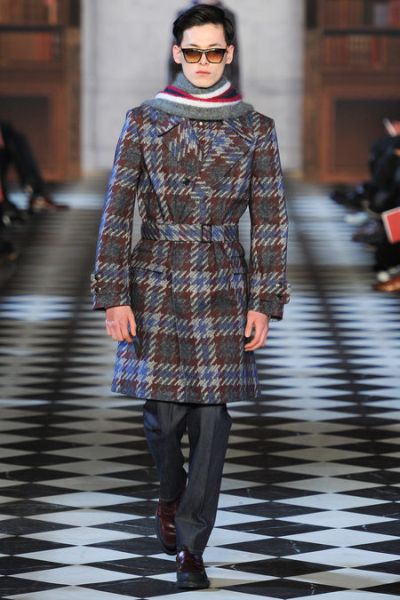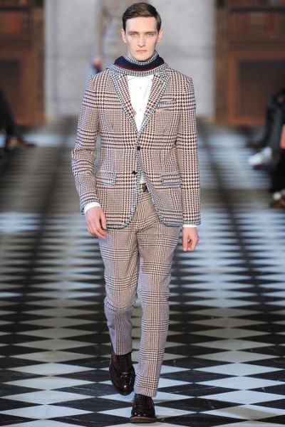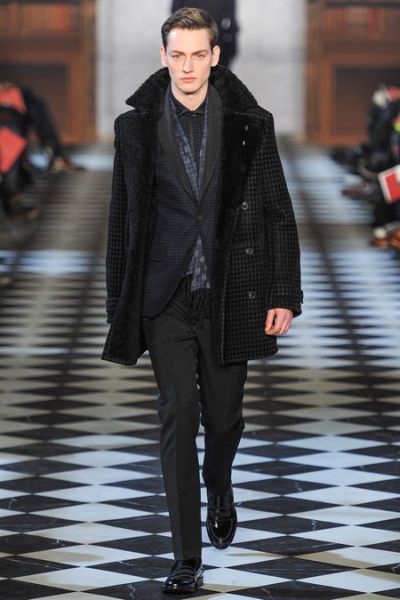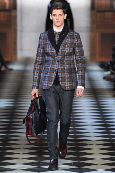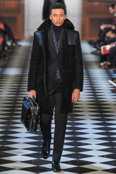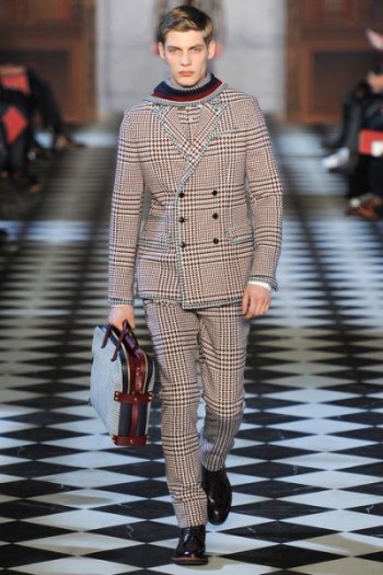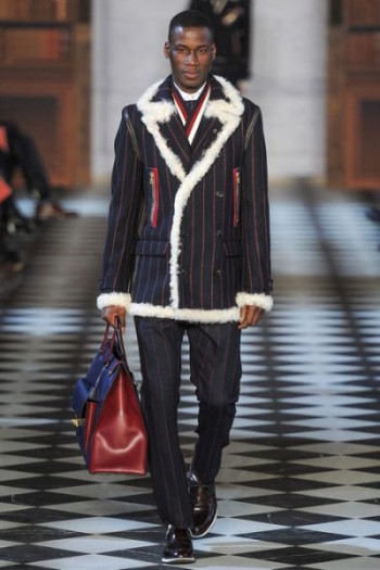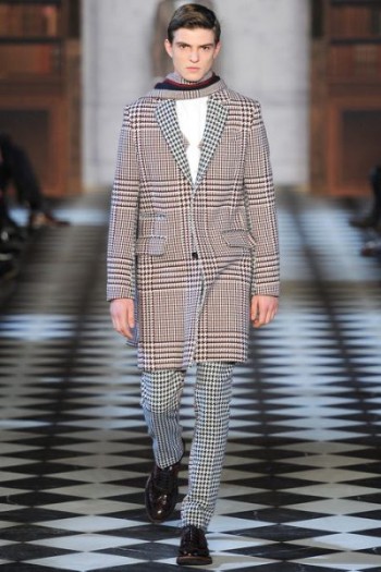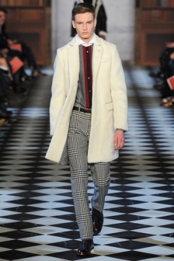 Brit Invasion–British tailoring meets a collegiate theme for the latest show from Tommy Hilfiger. Following prep-bred students of the east coast, the fall/winter 2013 collection brushes up on sportswear fundamentals with a modern twist in construction. Prince of Wales checks and houndstooth are manipulated, covering outerwear, creating trim and accenting an innovative foray. Adding a little edge with a 1960’s reference, touching upon the Beatles and Mick Jagger, slim tailoring creates a young element.