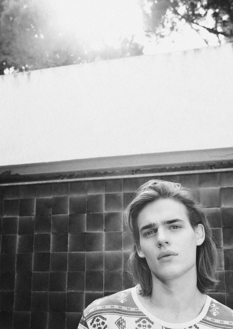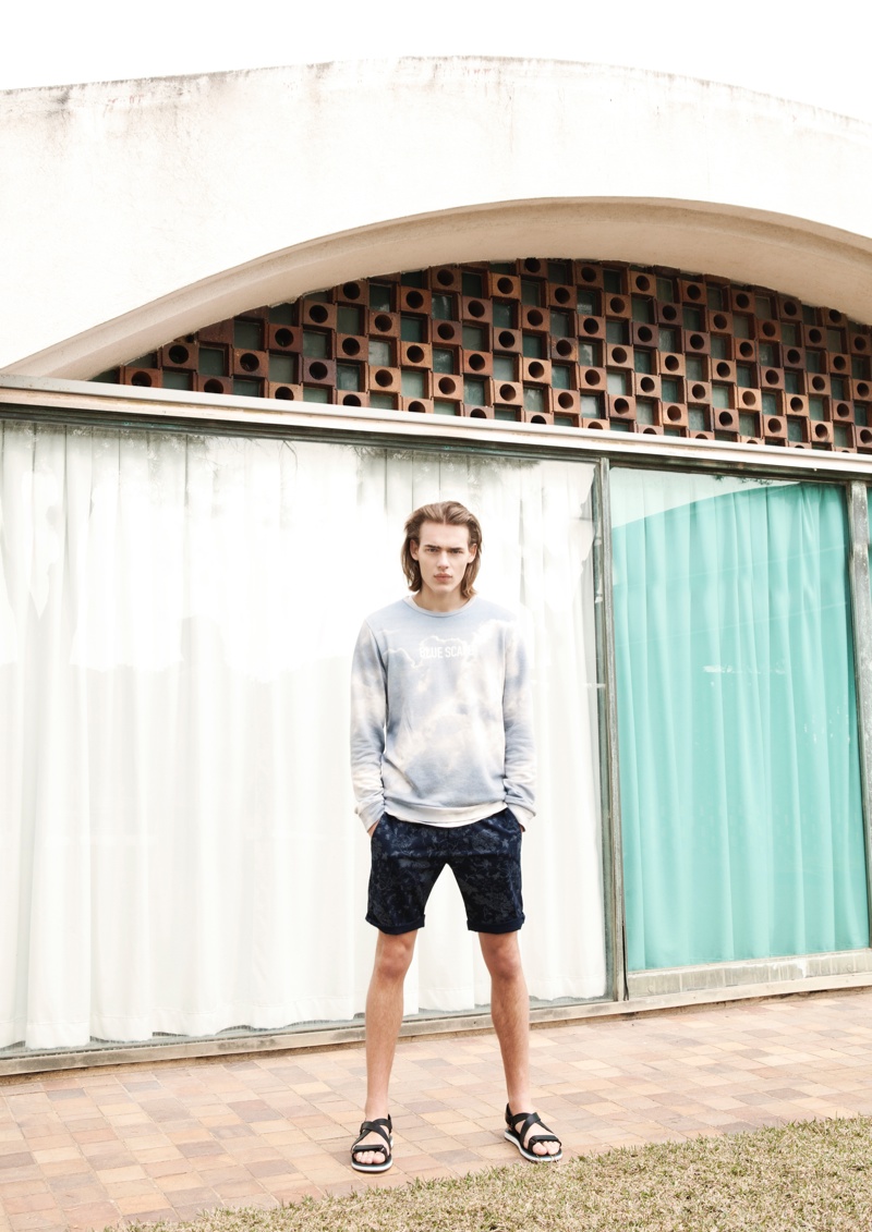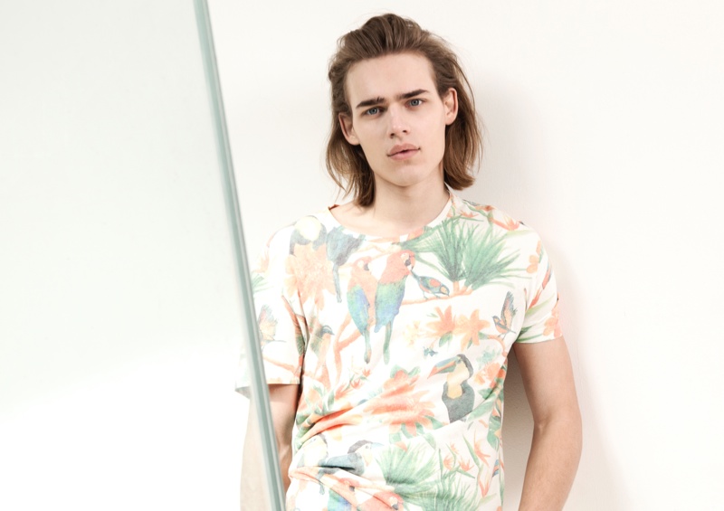 Bershka April Lookbook–Presenting its latest lookbook, Spanish label Bershka enlists the help of model Ton Heukels. Preparing for summer with a relaxed offering, Bershka rolls out a wardrobe, complete with intricate prints. Imagining a laid-back getaway, tropical prints are reinterpreted with dusty hues inspired by a mix of classic paintings and pop art. Here, floral prints and graphics of serene elements like clouds dress tops that are paired with pants, shorts and sandals.