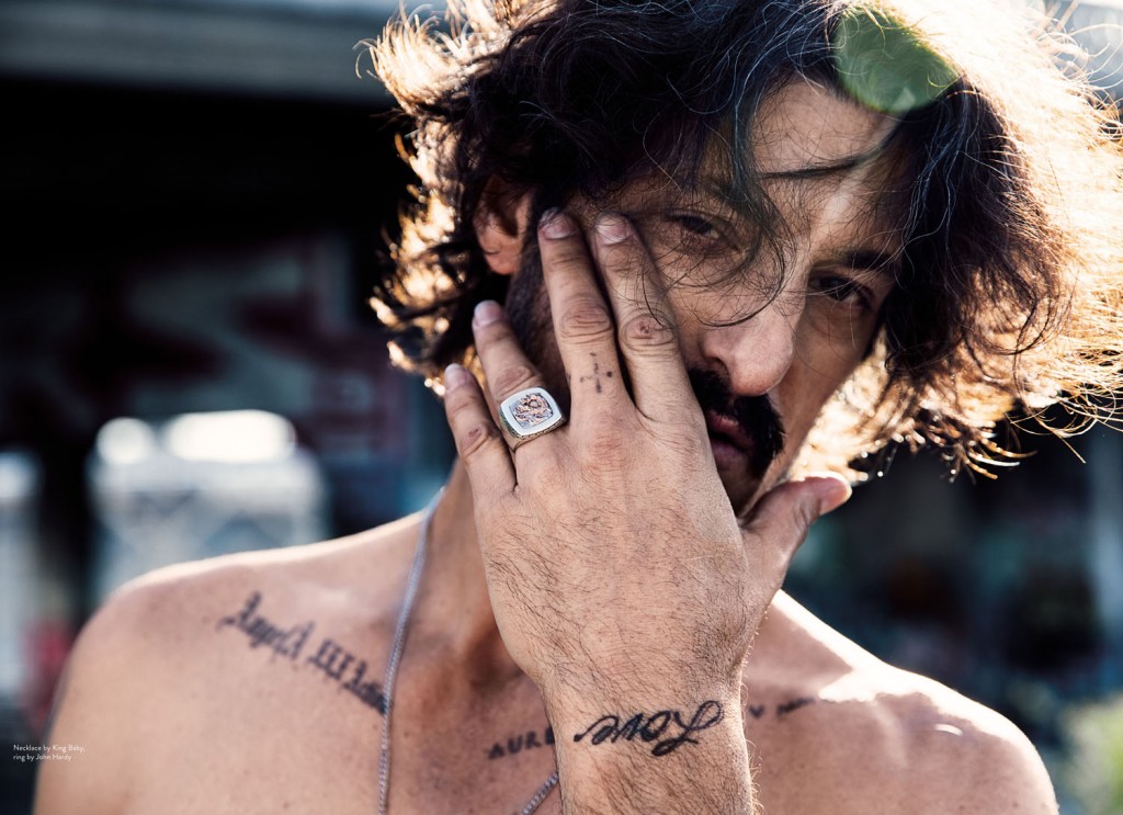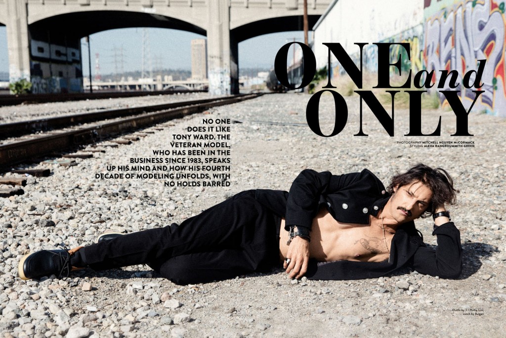 It’s a season of top models for Da Man Style. After stories featuring Lucky Blue Smith and Jason Morgan, the magazine enlists model icon Tony Ward for a cover shoot with photographer Mitchell Nguyen McCormack. Embracing leather and black fashions from designer brands such as Versace, Ward is styled by Alexa Rangroummith Green.