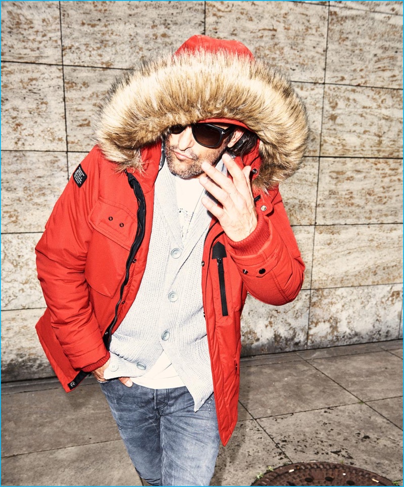 PinTony Ward braces himself for the cold in a Woolrich jacket with Replay jeans, a Wool & Co knit jacket, and Nowadays shirt for Wormland’s fall-winter 2016 campaign.