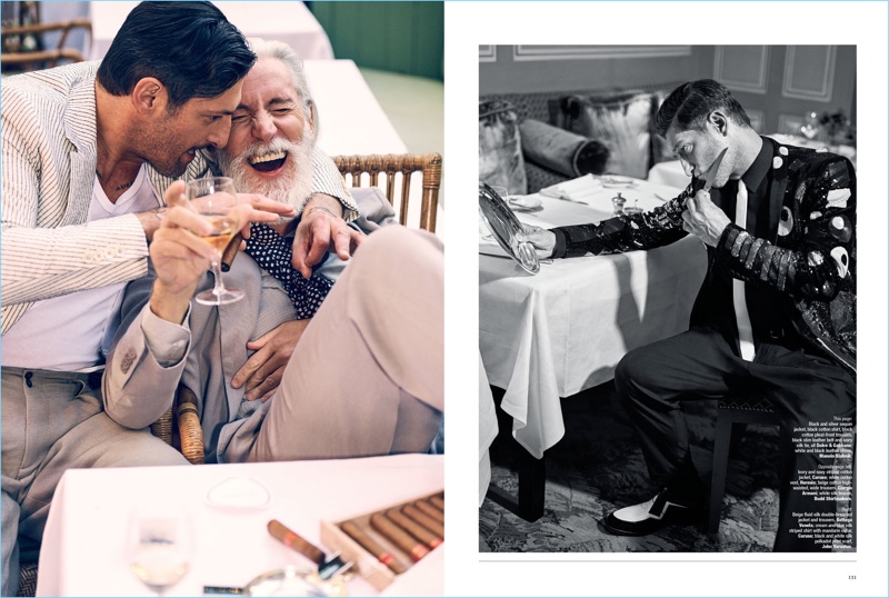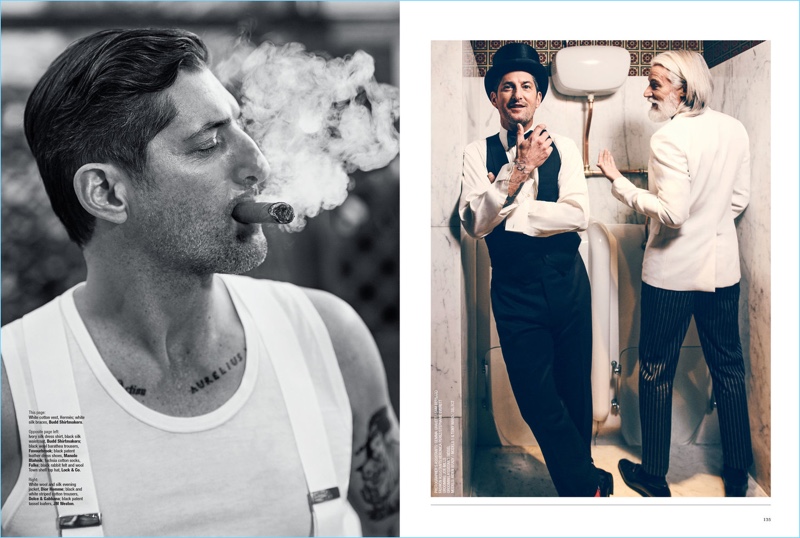 Smelling a cigar, Aiden Brady wears a Bottega Veneta suit with a Caruso shirt and John Varvatos scarf. Taking a smoke, Tony Ward wears a Caruso jacket with a Hermes tank, and Giorgio Armani trousers.