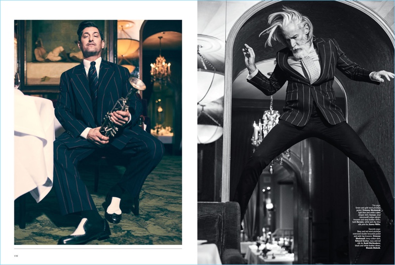 Left: Tony Ward relaxes in a Dolce & Gabbana double-breasted blazer, Ermenegildo Zegna Couture trousers, and Turnbull & Asser scarf. Right: Aiden Brady wears a Massimo Piombo double-breasted jacket with a shirt by The Gigi and Michael Kors jeans. Aiden also wears Rubinacci shoes. Tony Ward sports a double-breasted jacket, trousers, and tie by Caruso with a Brunello Cucinelli shirt and Rubinacci shoes.Pin