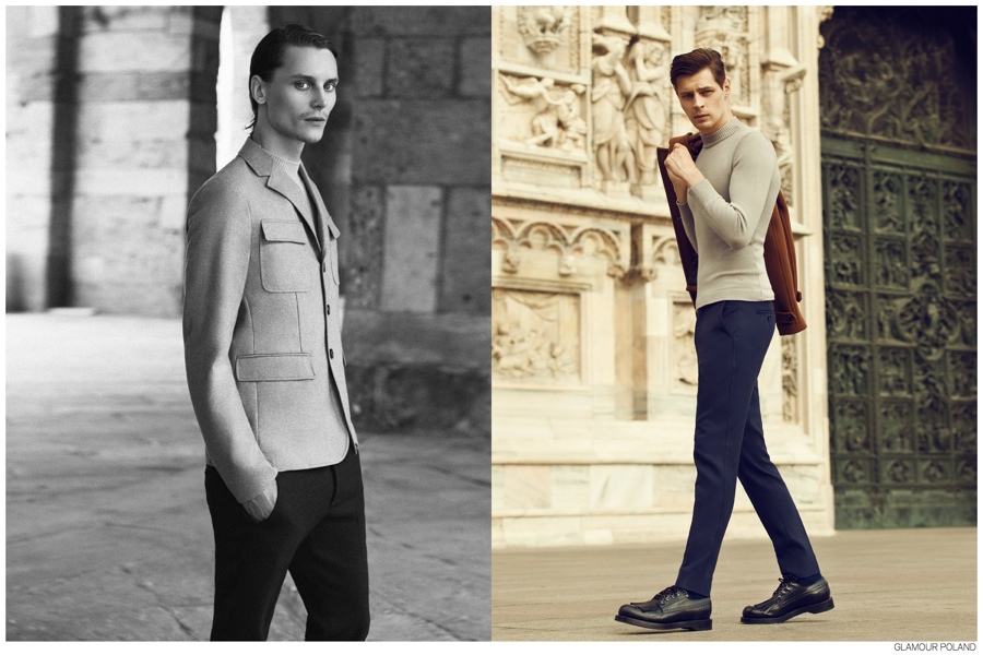 Men in Town-Shot during Milan Fashion Week at the Duomo this past June, top Polish models came together for a fashion editorial featured in the September 2014 issue of Glamour Poland. Photographed by Lukasz Pukowiec, models Tomek Szczukiecki, Adrian Wlodarski, Anatol Modzelewski, Greg Nawrat, Wojtek Czerski and Pawel Binczak appear in individual and group shots, highlighting their individual flair. Posing in fall 2014 garments from Italian fashion house Gucci, the Polish models were styled by Magda Jagnicka. / Makeup by Sarah Mierau. Hair by Pawel Solis.