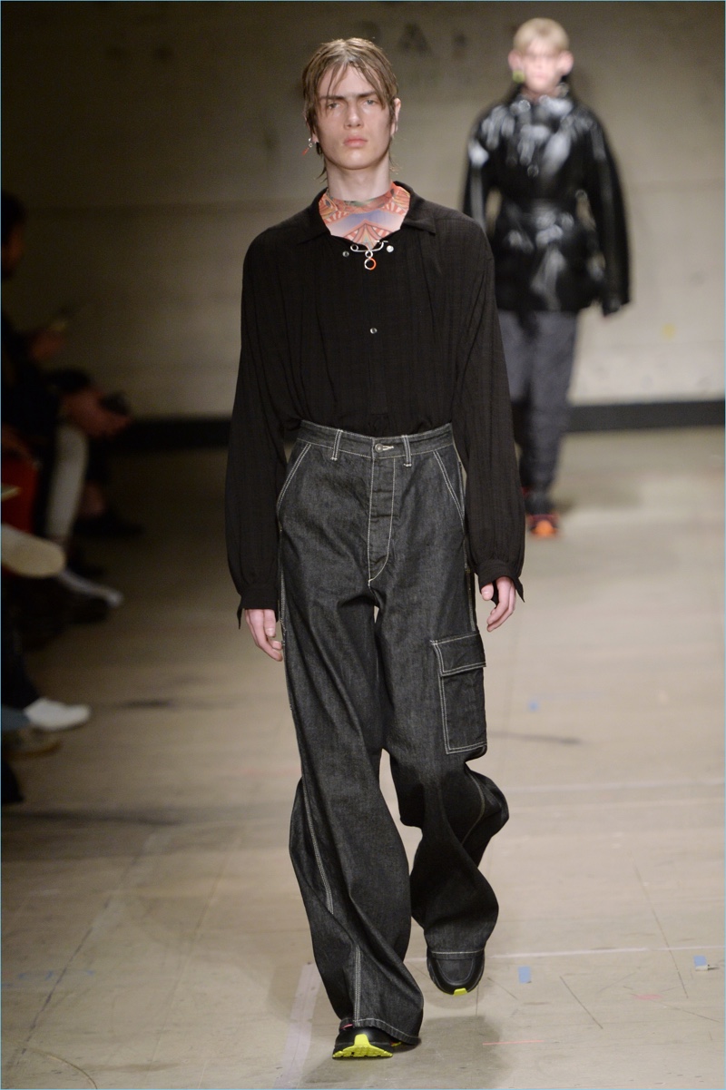 Evoking 90s style, Topman Design gravitates towards baggy denim jeans for fall-winter 2017.