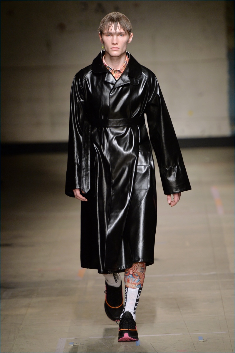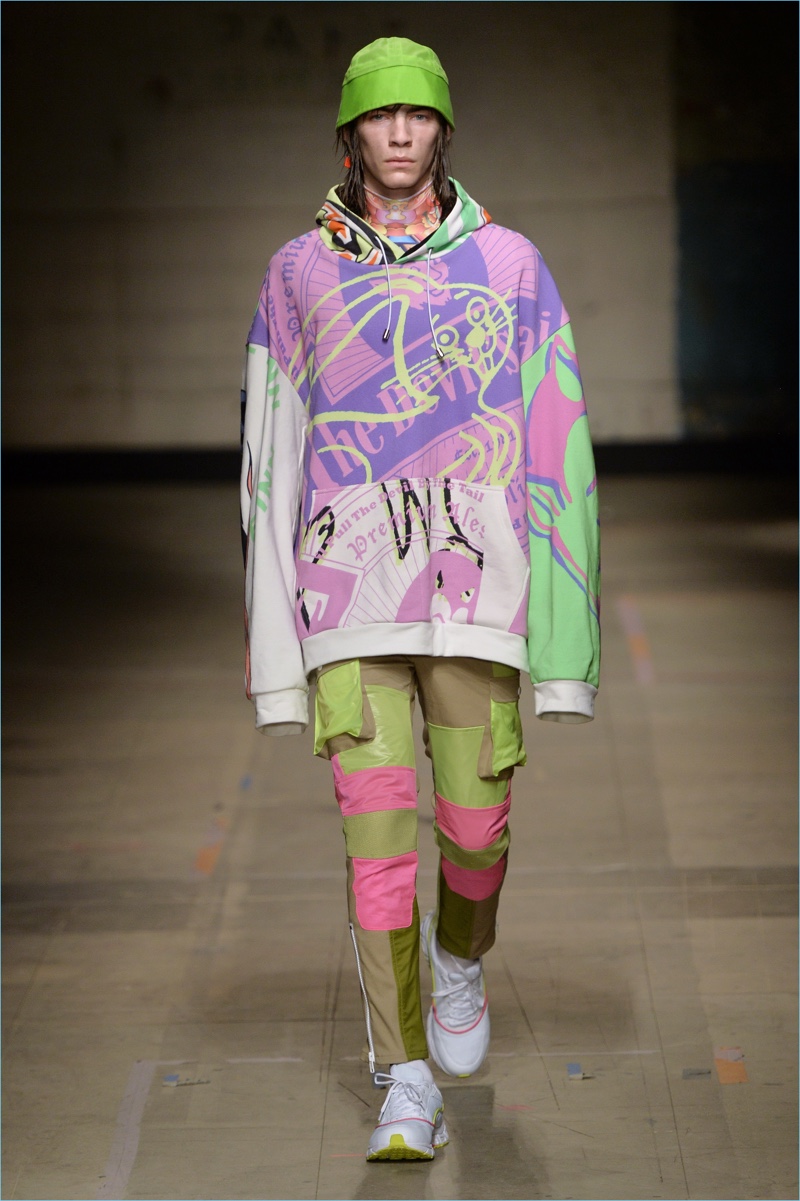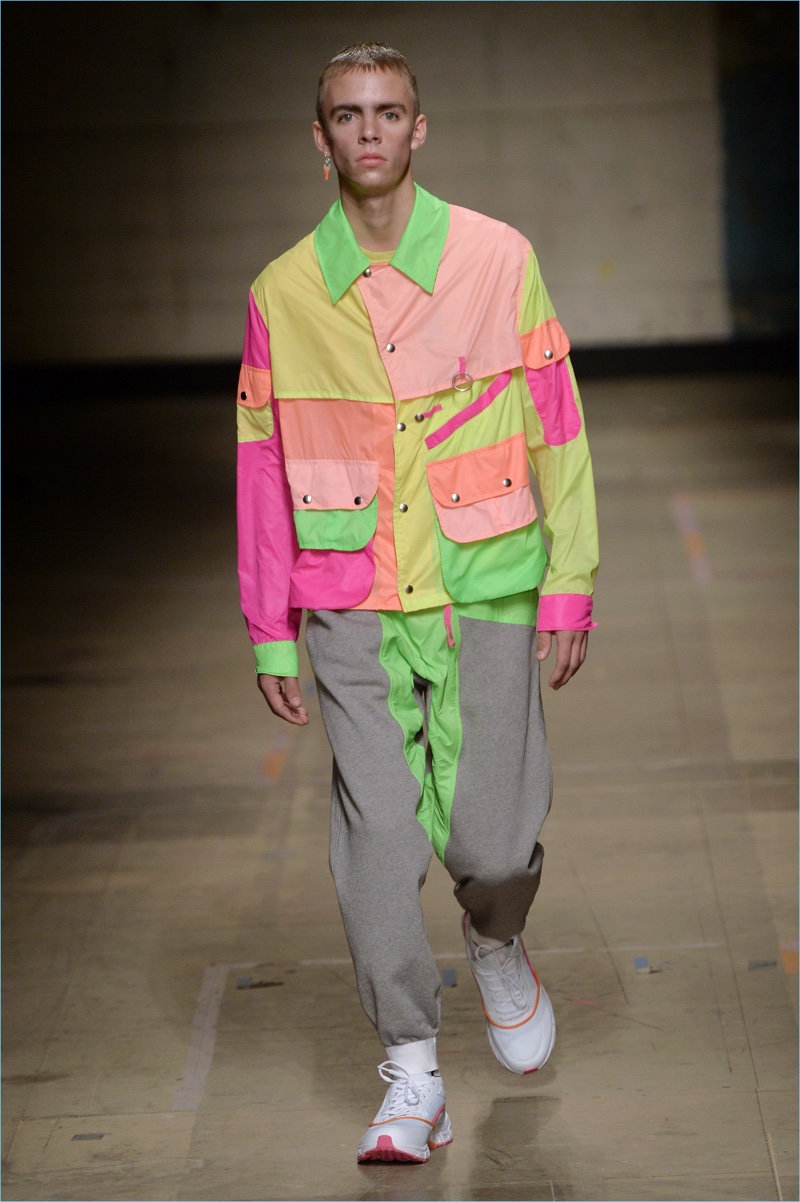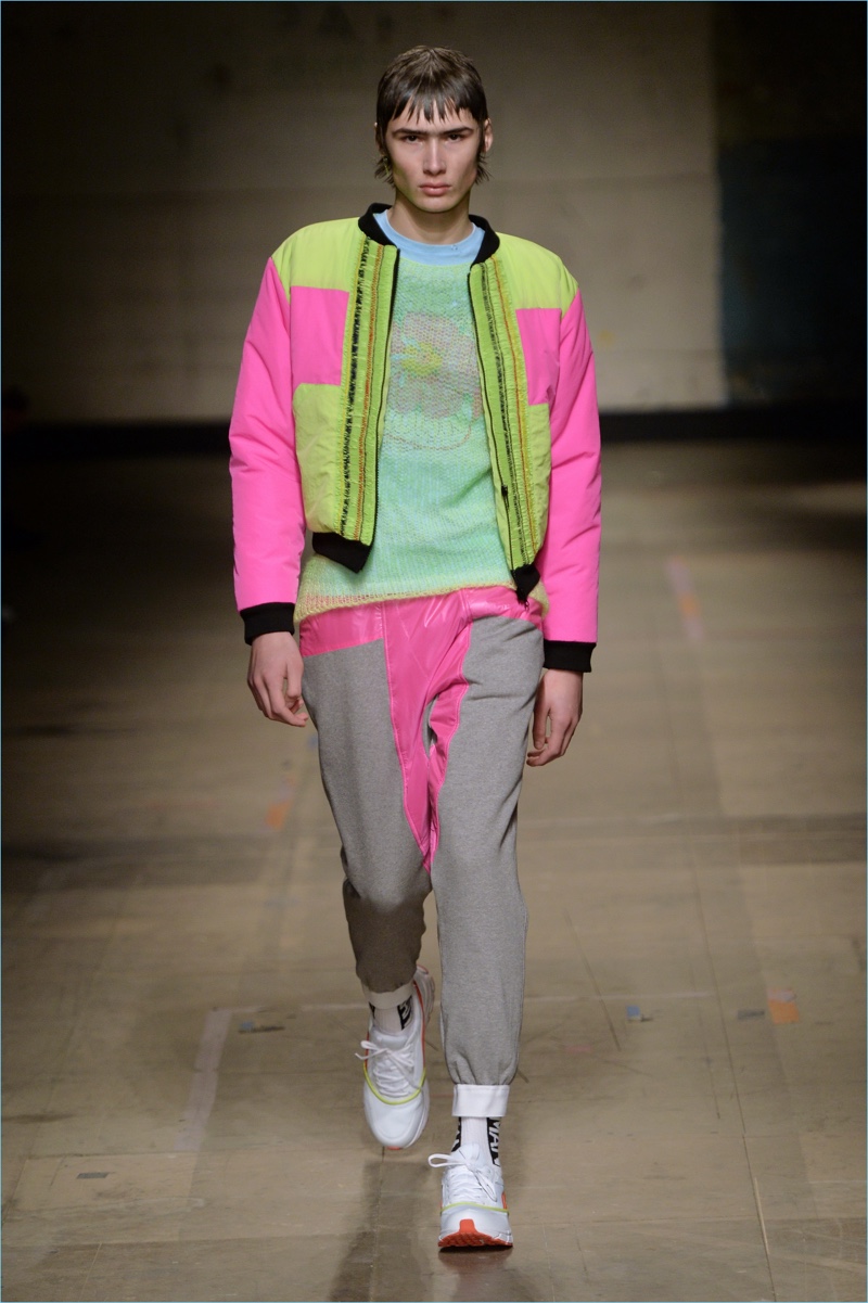 Channeling the club scene, Topman Design embraces fluorescent hues for fall-winter 2017. Here, Topman debuts a pink coat, worn with joggers and a graphic top.
