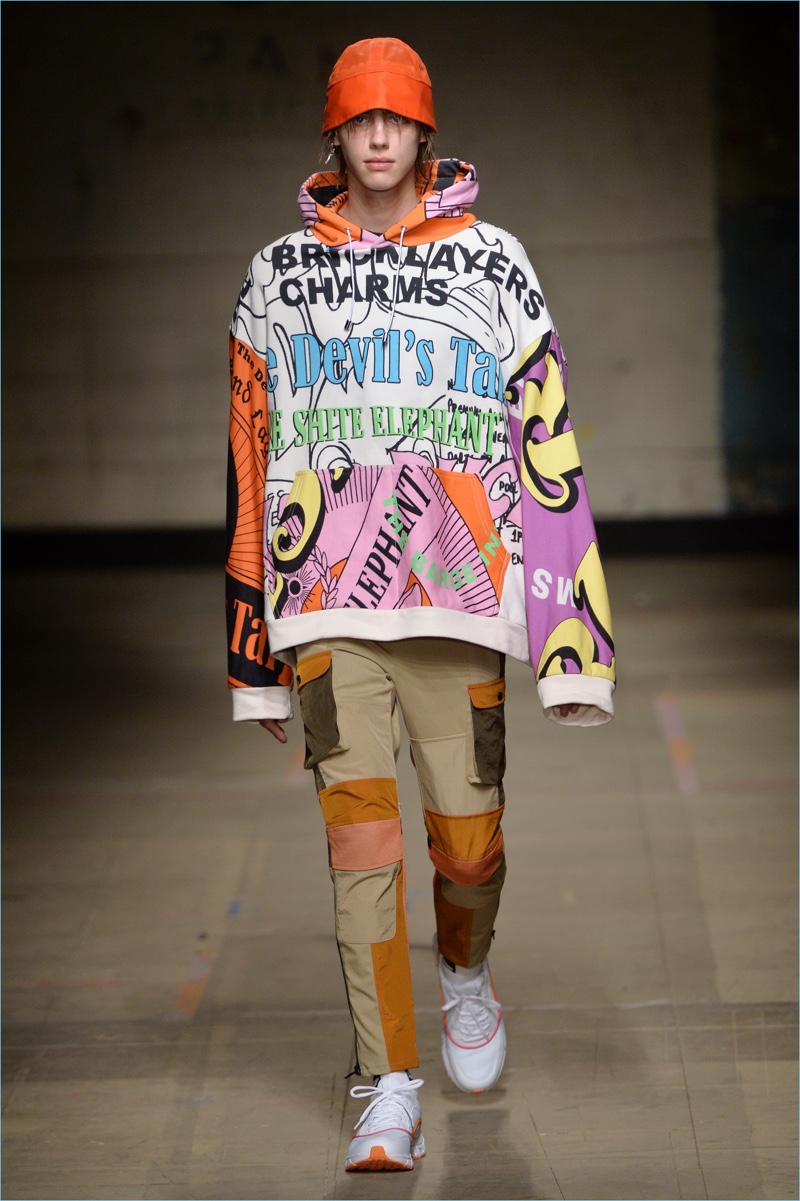 Transitioning from a relaxed stance on tailoring to graphic sportswear, Topman tackled a variety of aesthetics. Hero pieces for the season range from graphic hooded sweaters and waistcoats to baggy jeans and fluorescent fashions.