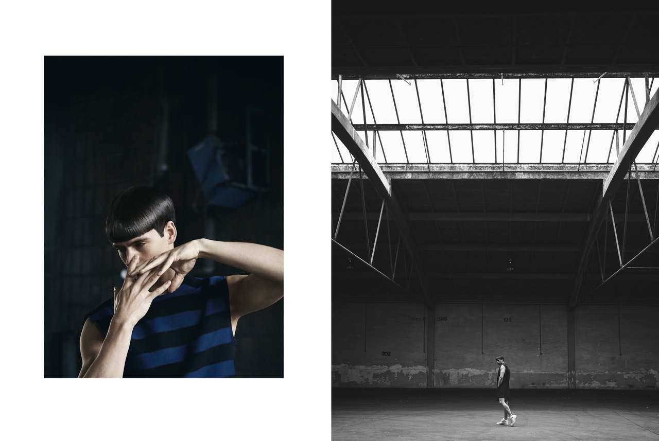 Beneath the Light–Stepping into a moment of serenity, Diva model Torbjørn Vinding Merinder appears before the lens of photographer Jannick Boerlum for our latest exclusive. Torbjørn channels a soothing calm in a cool color palette of navy, greys, and blacks, while looking sleek in minimalist sportswear and tailored separates, styled by Kristian Hindø-lings for a subdued and quiet set of portraits. / Grooming by Louise Frederiksen.
