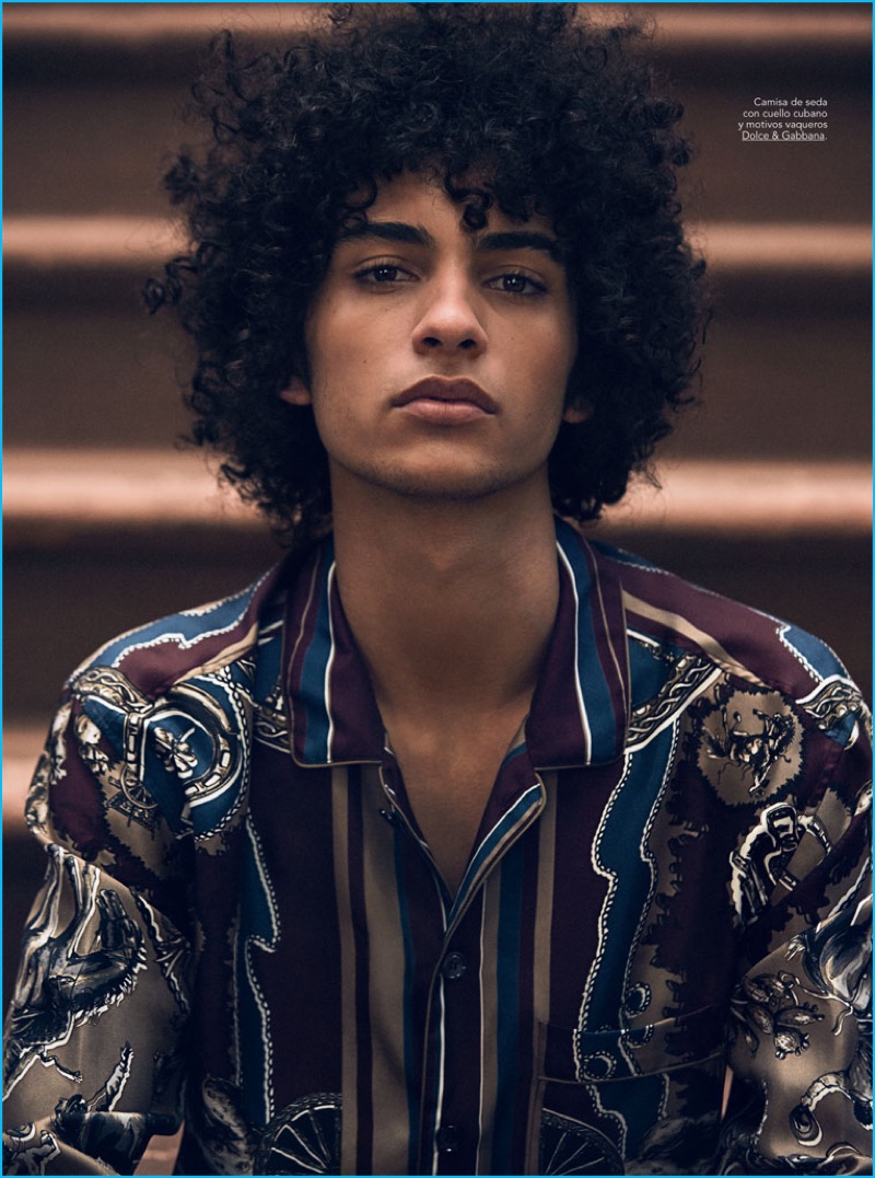 PinTre Samuels dons a western-inspired shirt from Dolce & Gabbana.