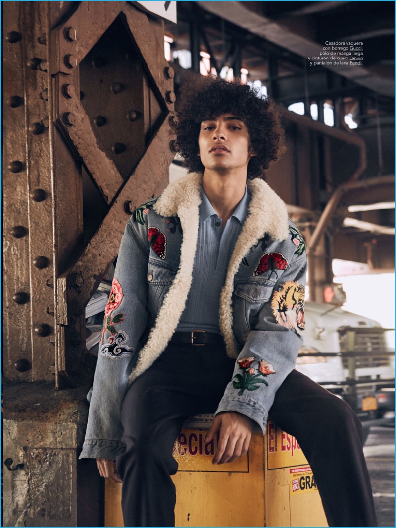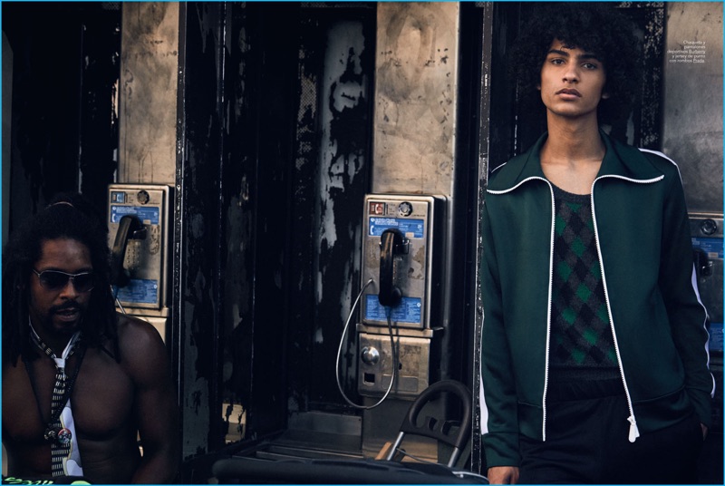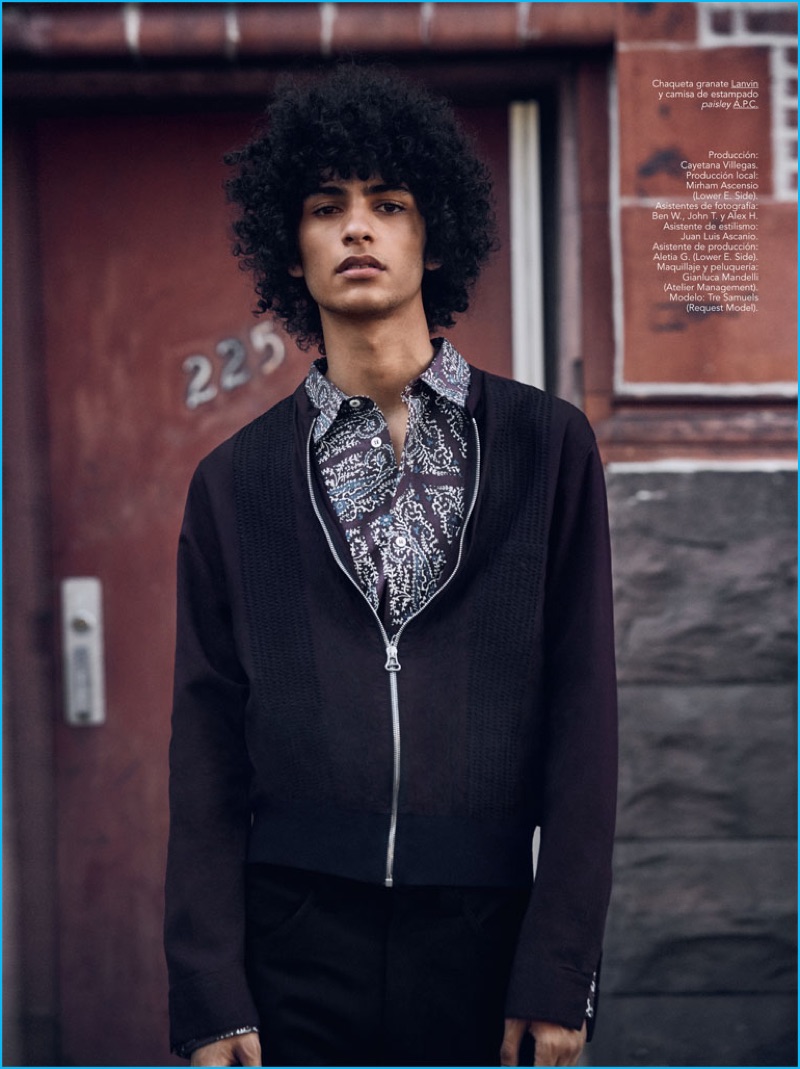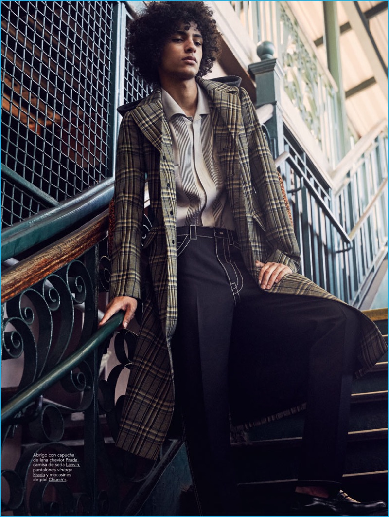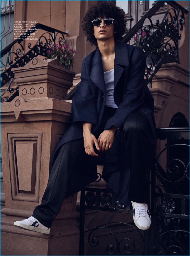 PinVenturing to Harlem for GQ España, Tre Samuels dons a Gucci denim jacket with Fendi trousers, and a Lanvin polo.PinEmilio G. Hernandex photographs Tre Samuels in a decadent suit and graphic turtleneck from Dries Van Noten.PinGoing sporty, Tre Samuels dons a Burberry track jacket and pants with a Prada argyle print sweater.PinJoana de la Fuente outfits Tre Samuels in a check H&M Studio coat with an Adidas Original shirt, Lanvin trousers, and Church’s dress shoes.PinA cool vision, Tre Samuels dons a Marni coat with Burberry trousers, a Ocean top, Saint Laurent sneakers, and Prada sunglasses.