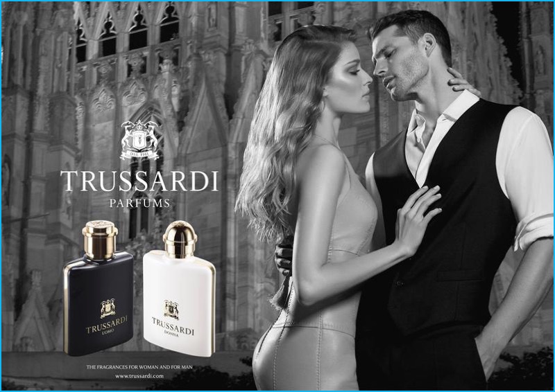 Trussardi promotes its fragrances with a black & white advertisement featuring models Alisa Ahmann and Tomas Skoloudik. Photographer Cuneyt Akeroglu captures the romantic outing for Trussardi Uomo and Donna. Representing Trussardi’s man of style, Tomas is front and center in a waistcoat and trousers with a white dress shirt.