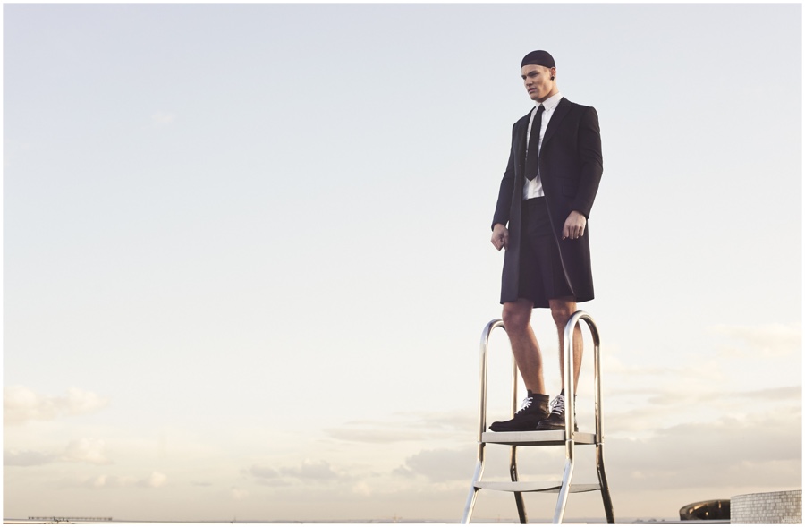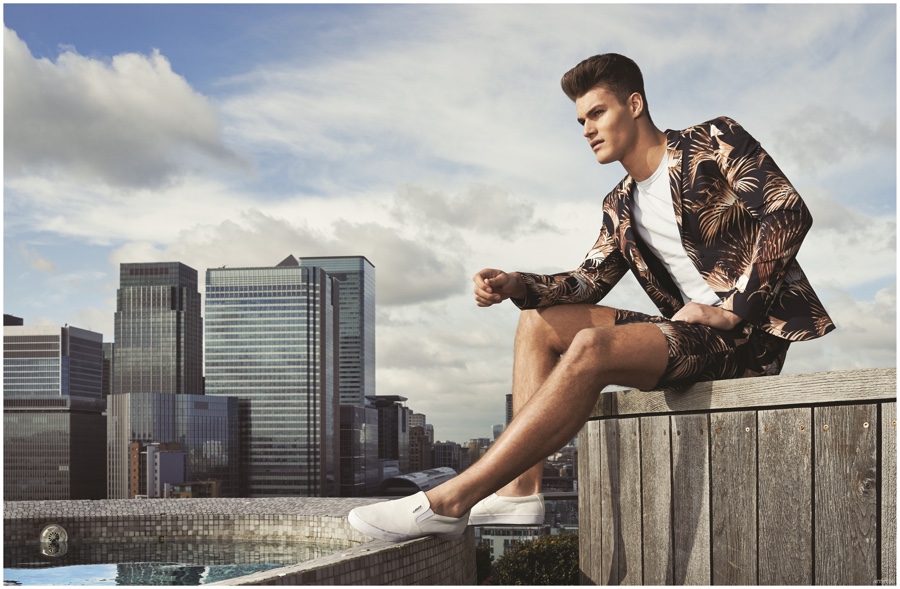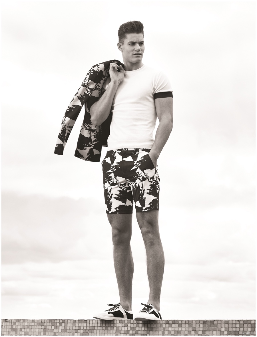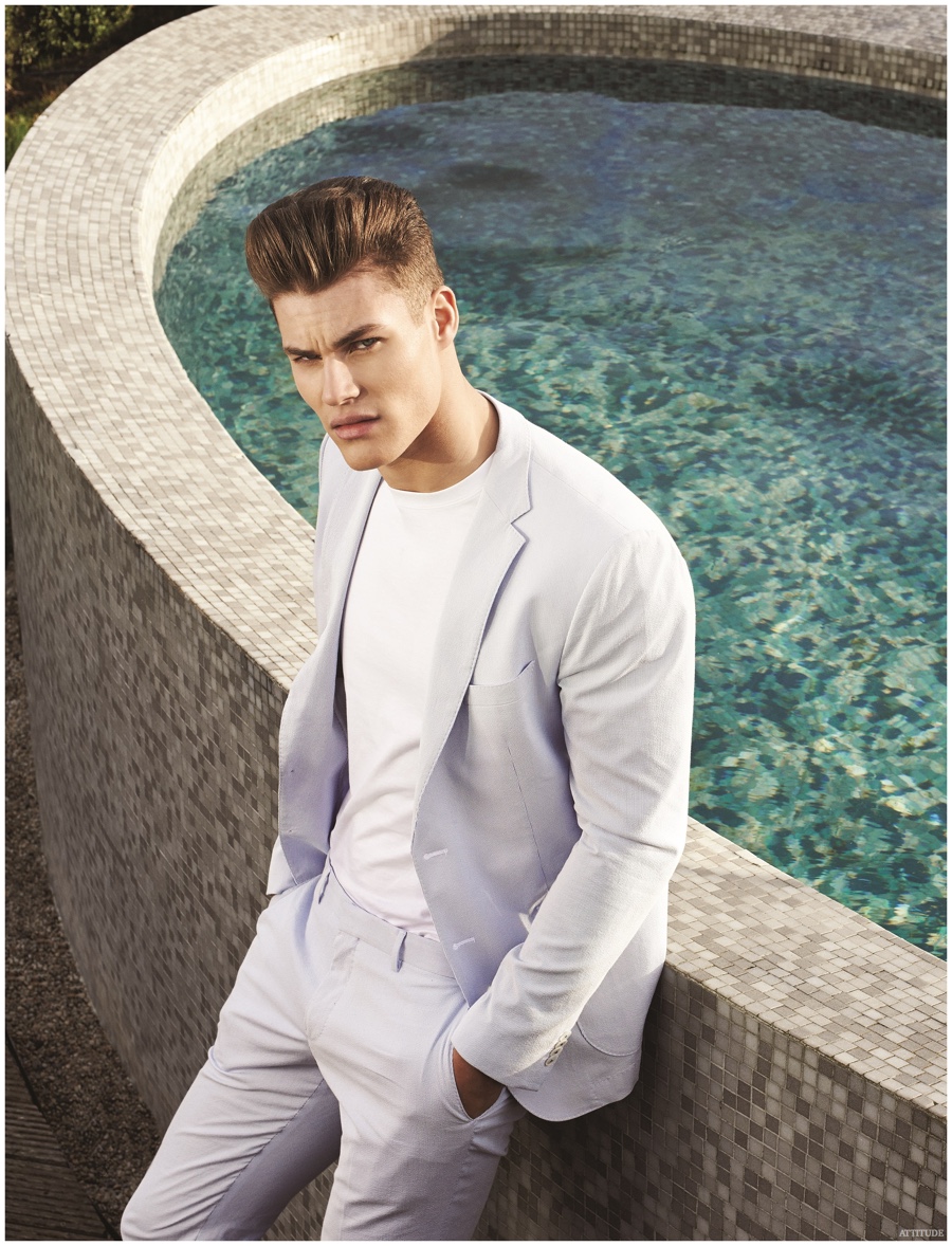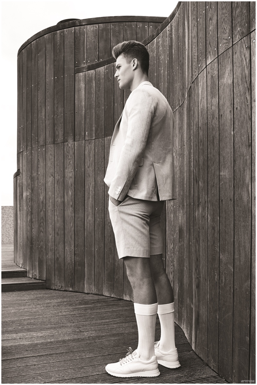 Sporting a flat top hairstyle, Tyler Maher graces the April 2015 issue of Attitude magazine with a new fashion spread lensed by photographer Florian Renner. Entitled I’ve Got to Heat It Up, the editorial features short suits and other versatile options pulled together by Joseph Kocharian. / Hair by Sven Bayerbach. Makeup by Nibras. Style assistance by Nick Byam.