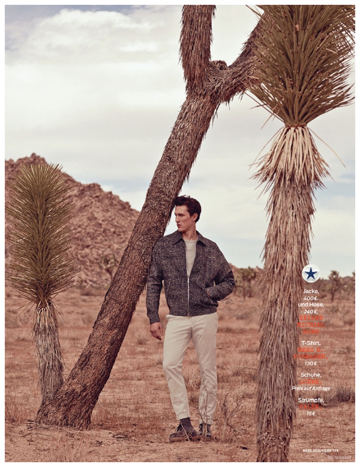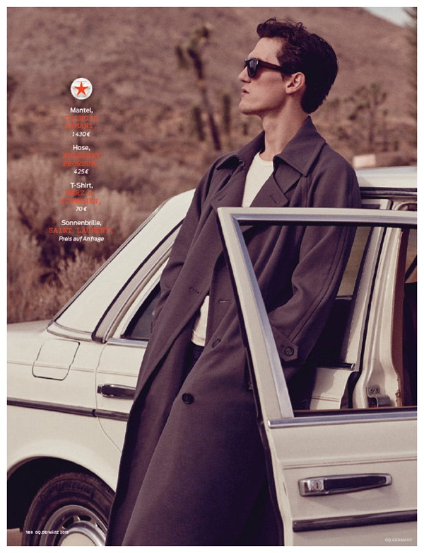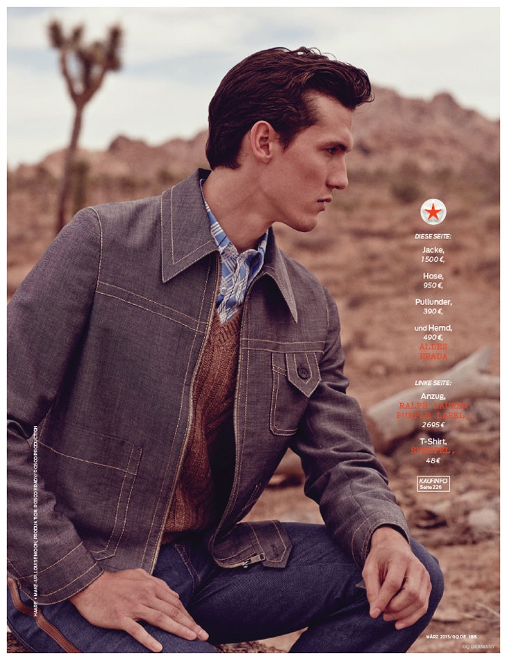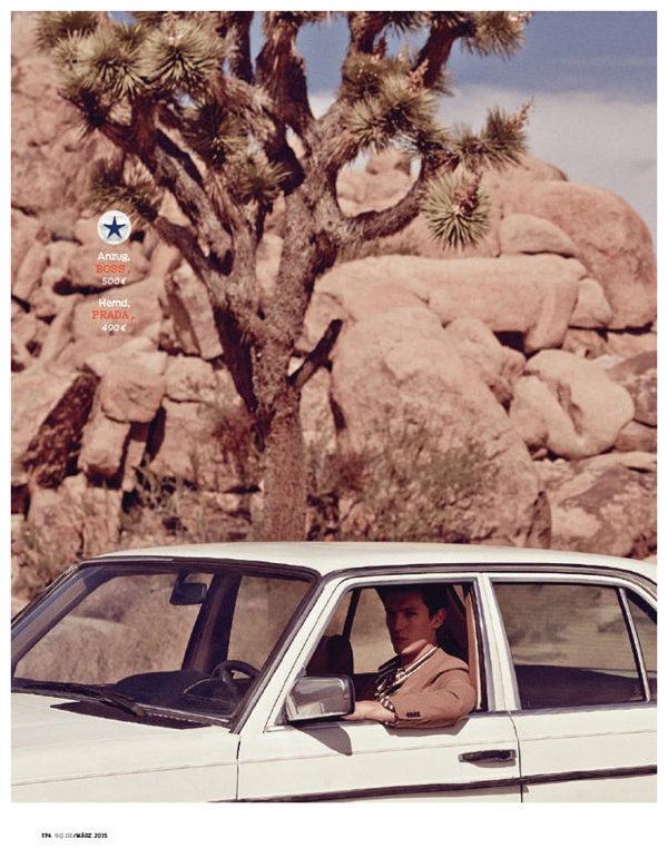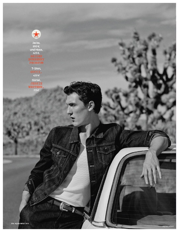 American model Tyler Riggs is featured in the March 2015 edition of GQ Germany. Connecting with fashion photographer Bruno Staub, Tyler embarks on a stylish road trip. Wearing western-inspired styles from the spring-summer 2015 collections, Tyler is pictured in denim and casual looks that put the spotlight on various labels, ranging from Prada and Giorgio Armani to Tommy Hilfiger. / Styling by Tobias Frericks.
