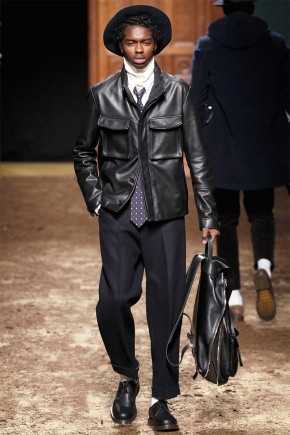 Umit Benan Fall/Winter 2014–Showing in Paris for the first time, designer Umit Benan created an old-school baseball field as he dedicated his latest collection to Jackie Robinson, the first African American to play in Major League Baseball. Using the occasion to attach a letter to varsity jackets, coats and more, a sporty spirit was reinforced throughout the collection. Relaxed silhouettes provided easy suiting that transitioned into quilted essentials sprinkled amongst more substantial pieces.