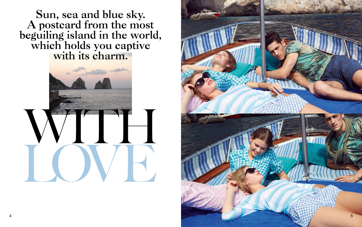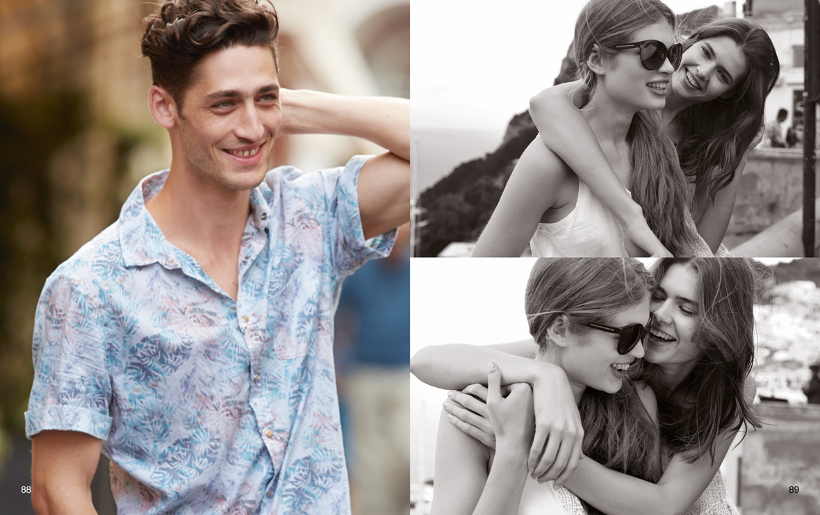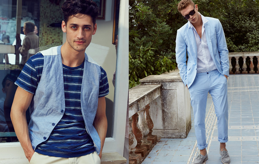 Island Life–Casual and classic island life is the theme of the United Colors of Benetton summer 2014 campaign, and model Carlos Ferra embodies the feel with confident ease. Blues and prints dominate the campaign photos styled by Ethel Park and shot by Cass Bird where Carlos appears alongside Andrea Bellesario. Lightweight vests, summer suits, floral print button down shirts, and printed T-shirts set the tone for a breezy summer vibe without veering away from the brand’s modern global standards.