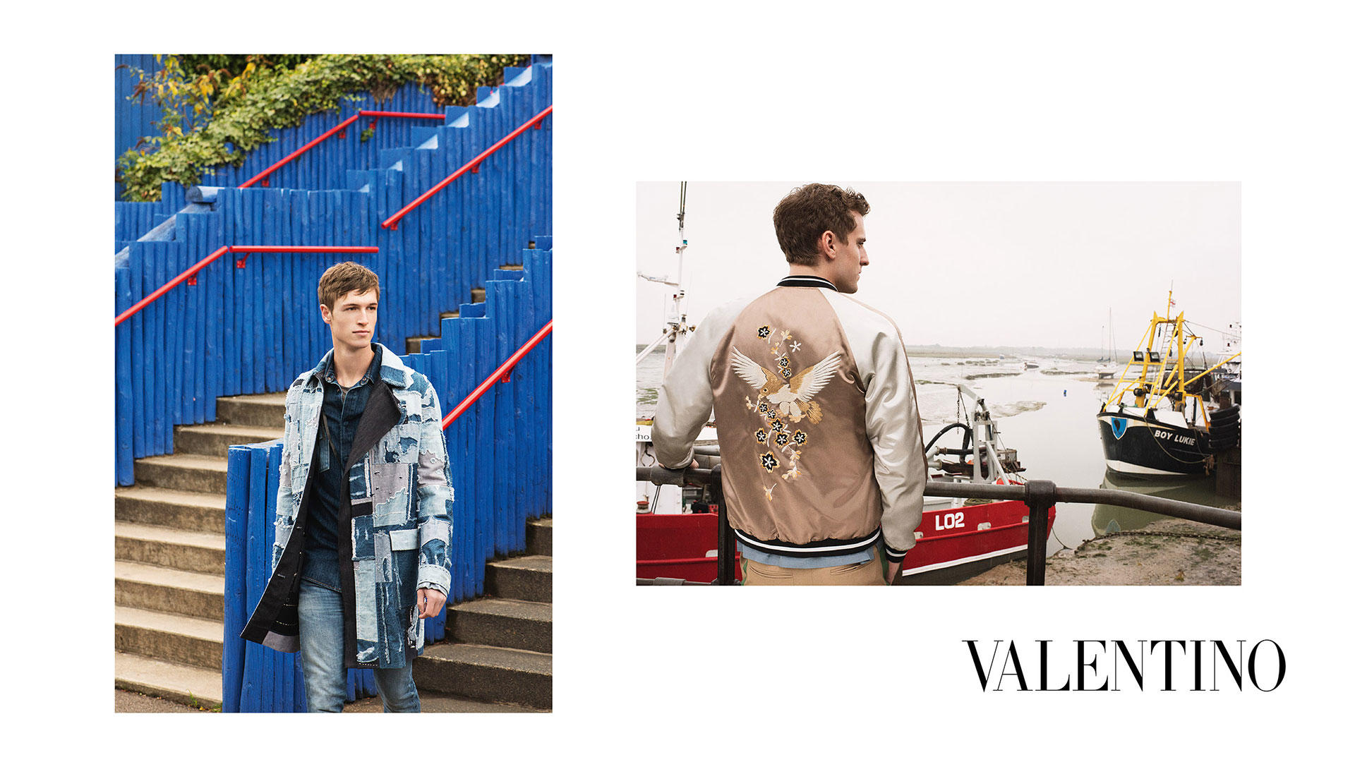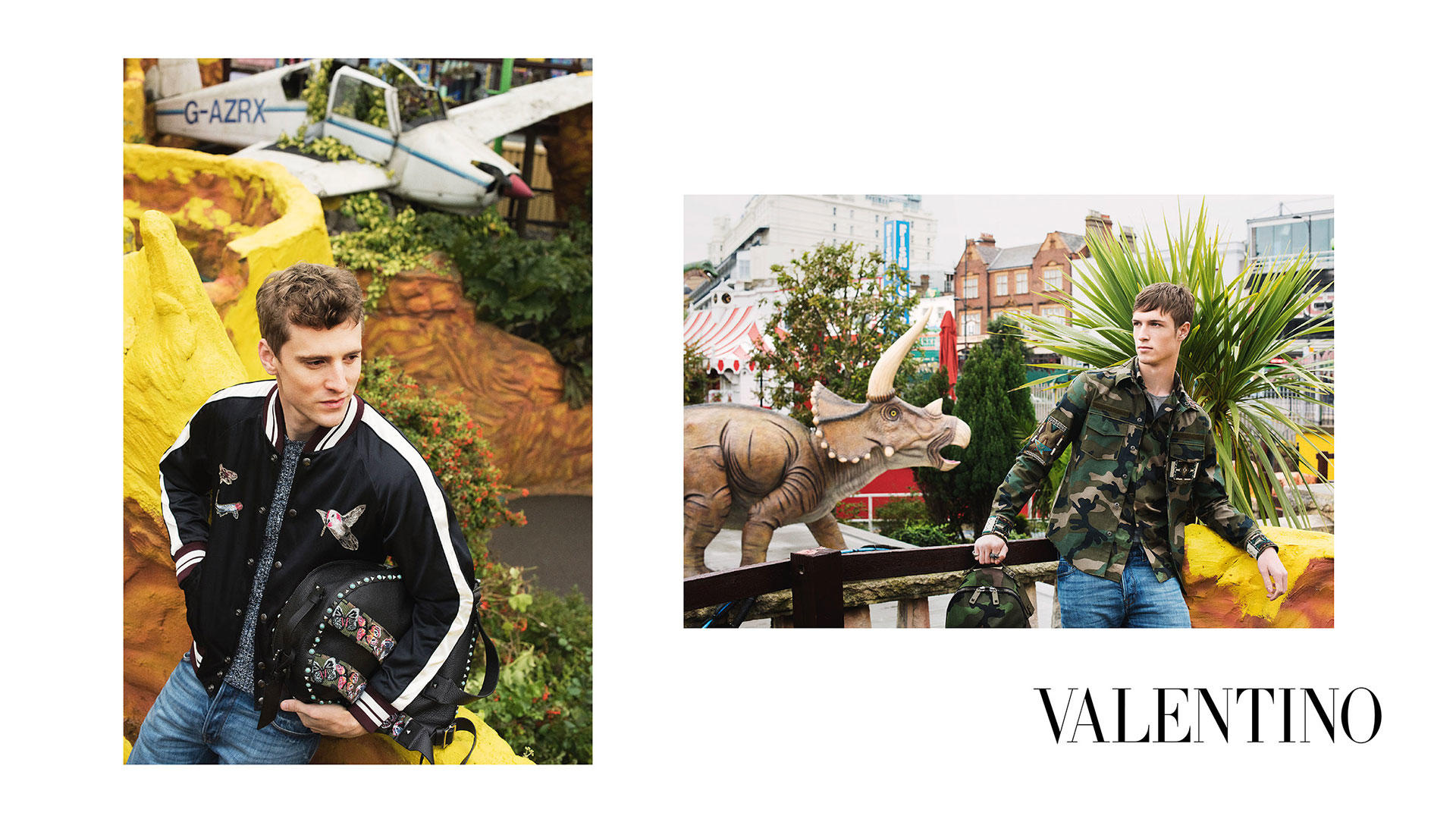 Valentino reunites with photographer David Bailey for its spring-summer 2016 campaign. Featuring George Barnett once more, the British model is joined by newcomer Egon Van Praet. Taking a casual approach to the season that mirrors the latest fashions from Valentino creative directors Maria Grazia Chiuri and Pierpaolo Piccioli, the pair venture to Adventure Island in Southend, Essex. Styled by Karl Templer, George and Egon model season highlights, which include satin bomber jackets and camouflage print outerwear.