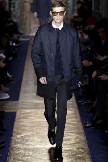 Adapting the Classics–Valentino designers Maria Grazia Chiuri and Pierpaolo Piccioli paint a dapper picture for the fall/winter 2013 season, referencing British style for an elegant collection that touches upon the 1960’s with a certain grace. Putting their men in navy, gray and hunter green, the looks were simply classic with a modern touch that was tasteful. Capes and outerwear were dissected by a bar of black while houndstooth made a sharp appearance. Incorporating plaid, leather and a hint of camouflage, Chiuri and Piccioli took their man from suave to fashion-forward with an effortless transition.