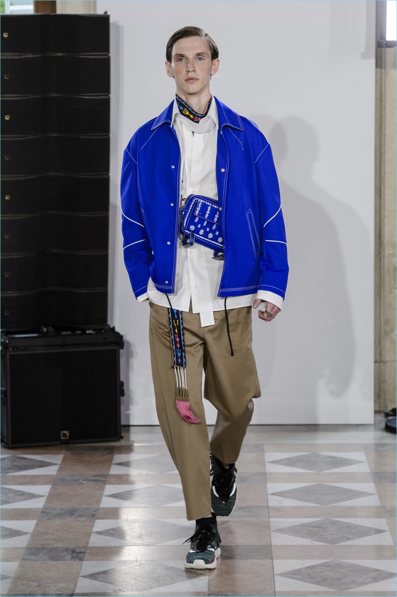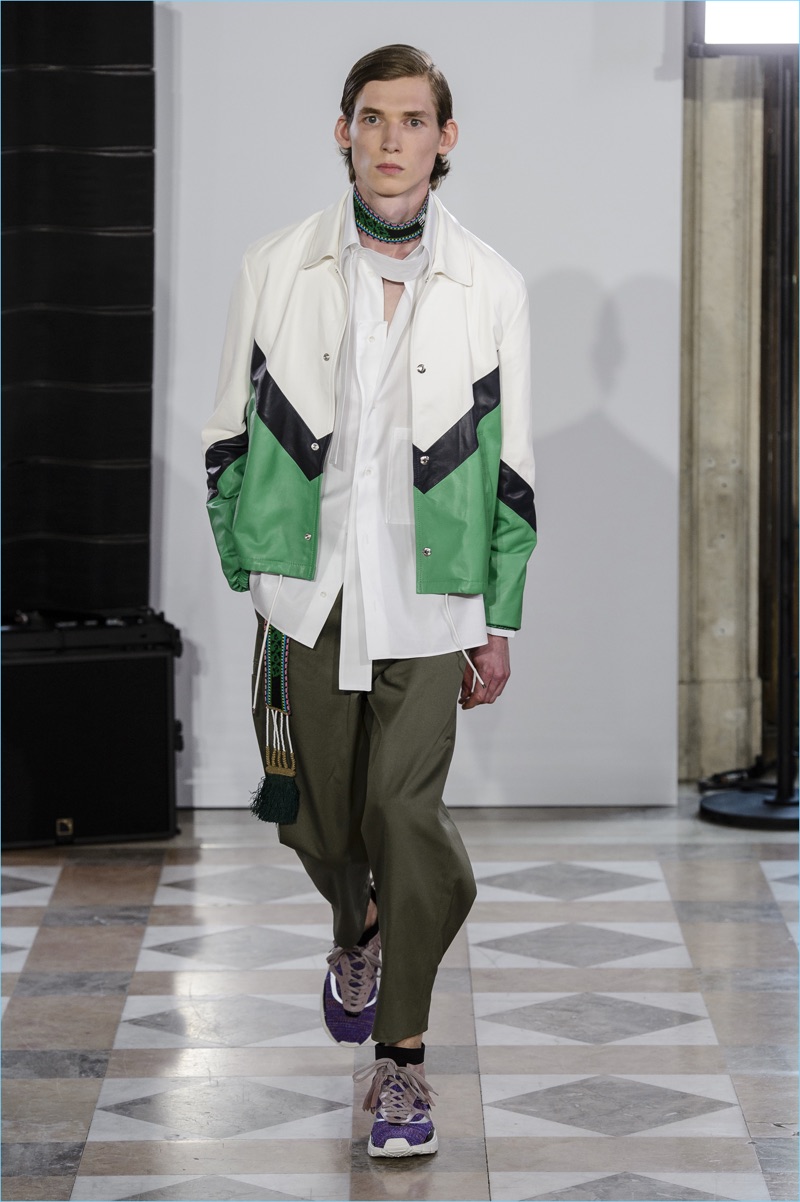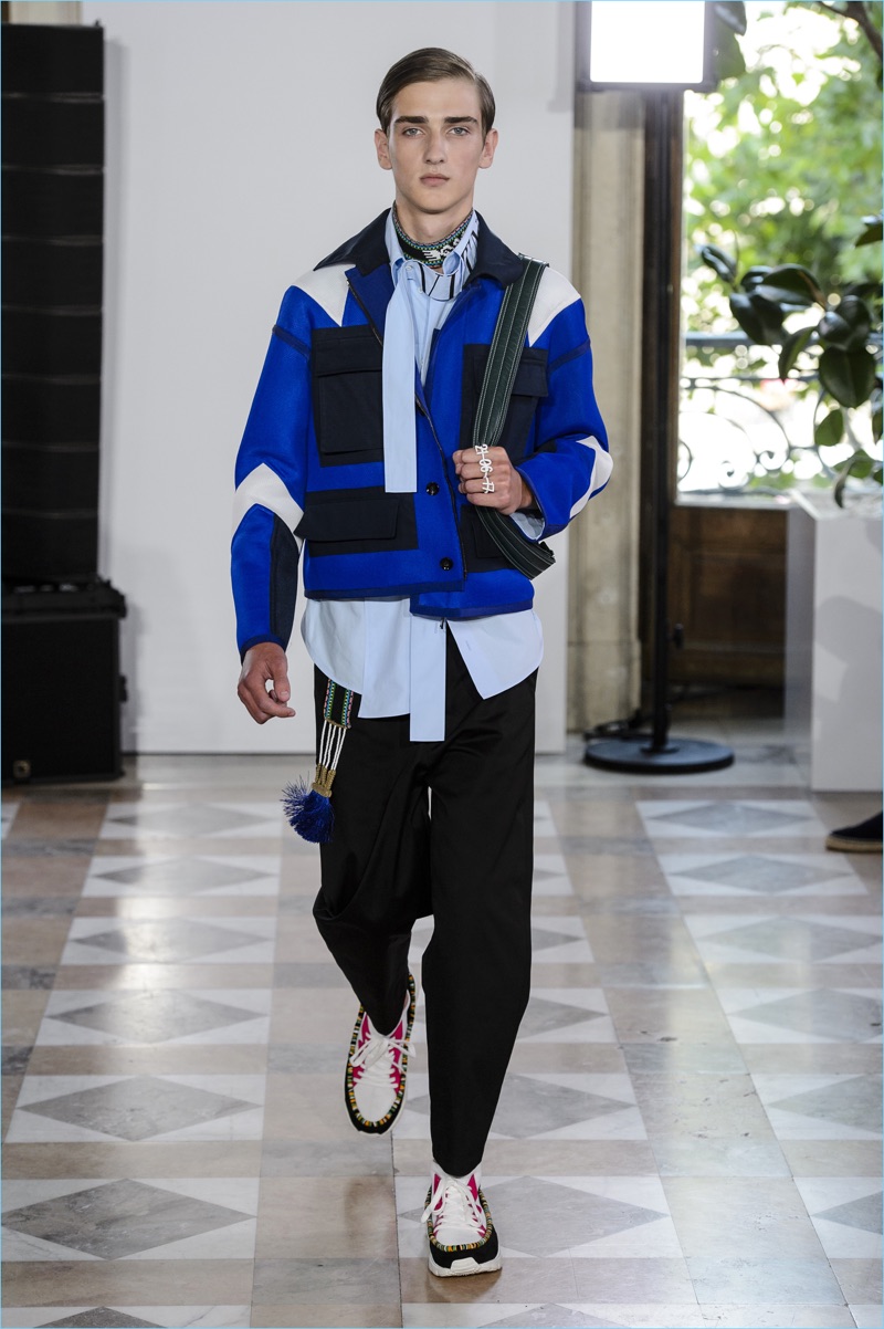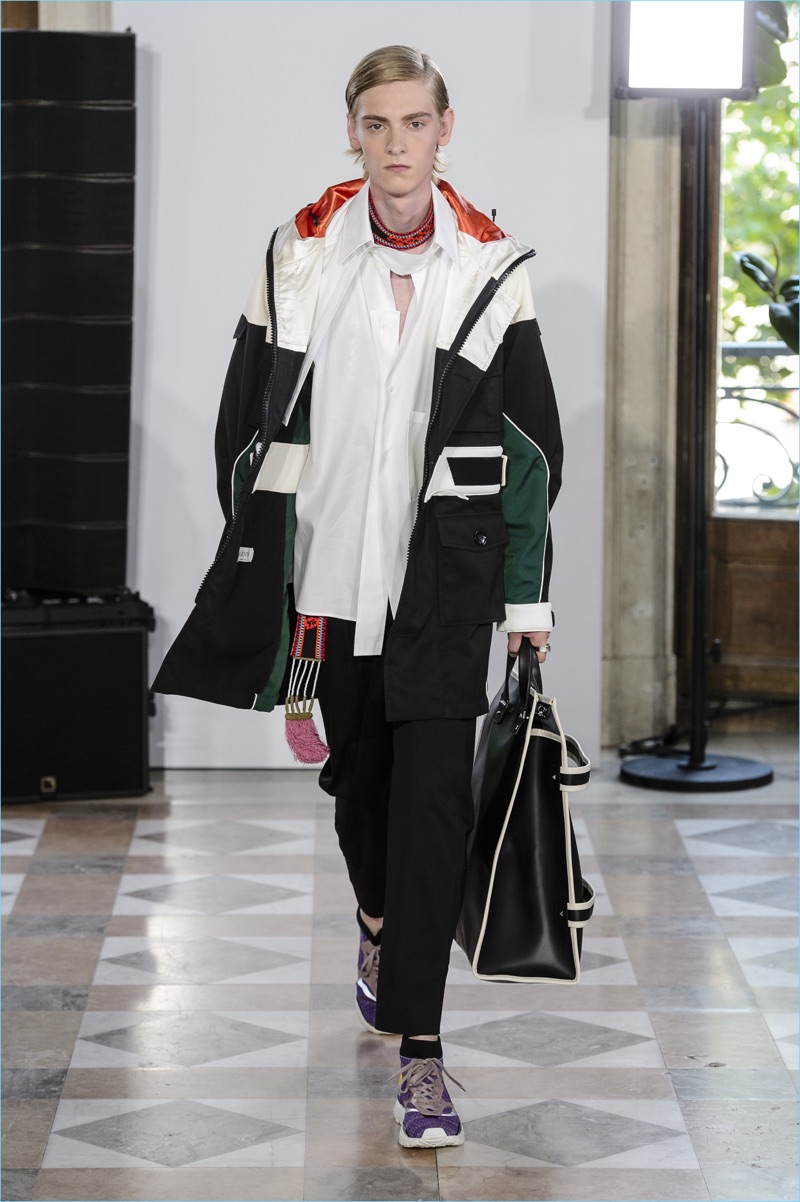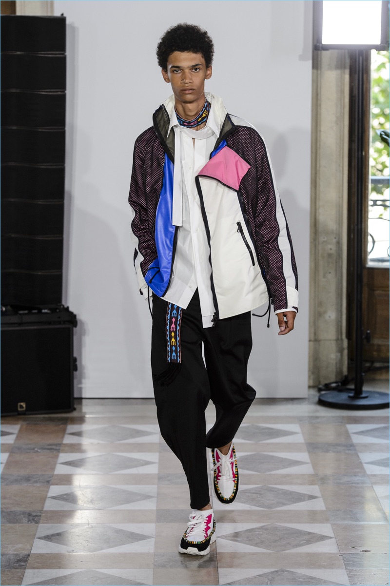 Valentino courts the current trends and takes a sporty detour for spring-summer 2018. Creative director Pierpaolo Piccioli lends the Valentino man a young edge for the season. Losing track of the suit, streetwear-influenced separates dominate the narrative. Color blocking and contrasted details decorate an easygoing lineup. Armed with sneakers and luxurious leather bags, Valentino’s man gravitates towards sporty jackets, relaxed trousers, and oversize shirts.