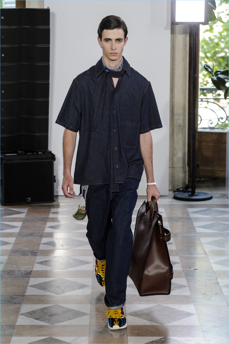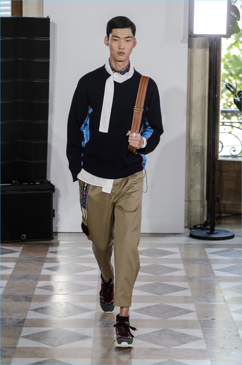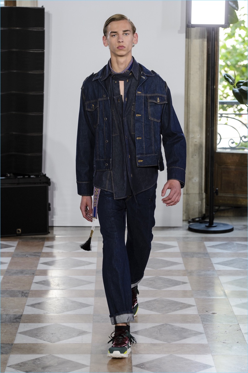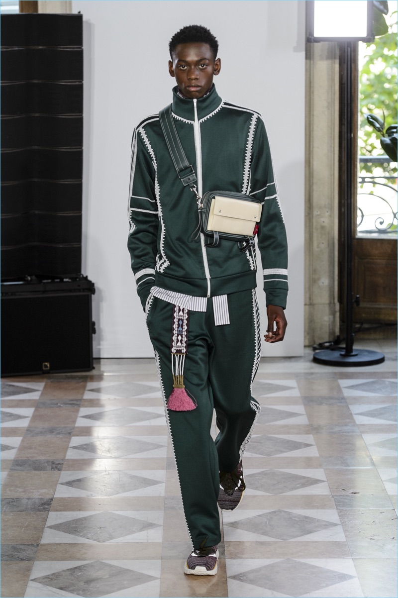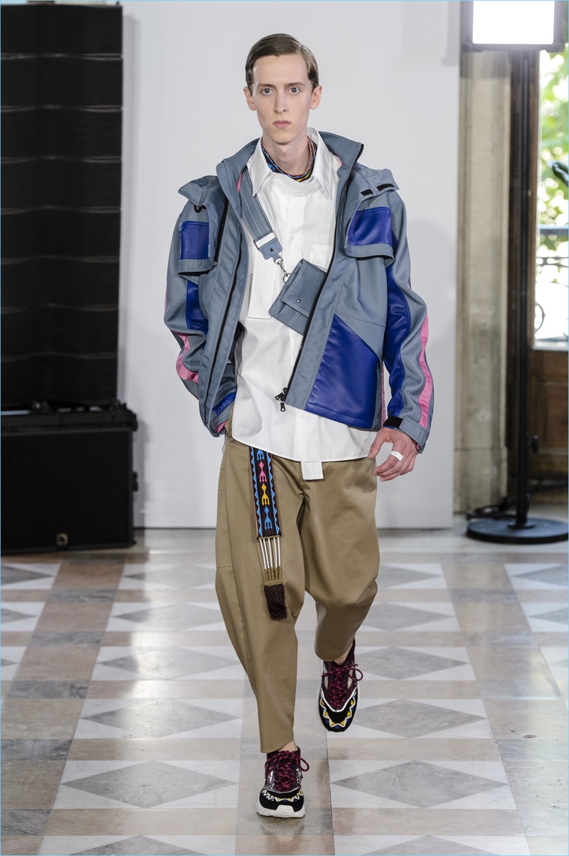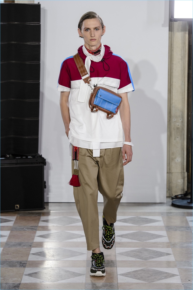 Valentino courts the current trends and takes a sporty detour for spring-summer 2018. Creative director Pierpaolo Piccioli lends the Valentino man a young edge for the season. Losing track of the suit, streetwear-influenced separates dominate the narrative. Color blocking and contrasted details decorate an easygoing lineup. Armed with sneakers and luxurious leather bags, Valentino’s man gravitates towards sporty jackets, relaxed trousers, and oversize shirts.