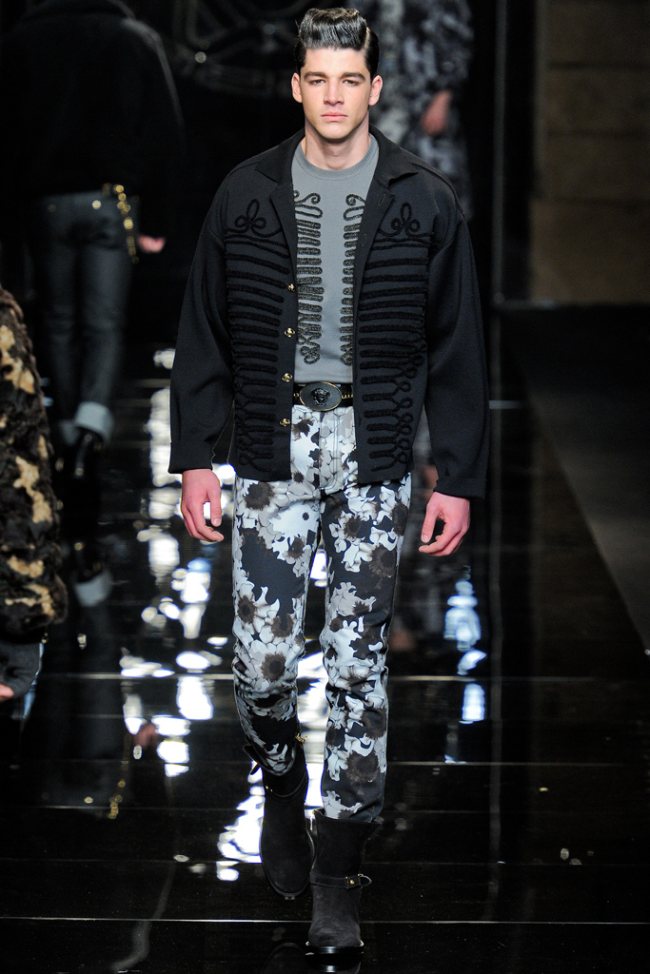 Donatella’s Troops–Versace creative director Donatella Versace gets the troops in order for her latest collection. Putting a militaristic spin on Versace’s signature flamboyance, varied segments came together under the directive of several styles. Beginning the show with suiting, dressed in camouflage, the range transitioned to studded blue denim before moving on to audacious ensembles in red. With electric pastels appearing beneath red coats, Versace set the stage for a parade of coordinated separates in camouflaged florals. Finally, bringing her men home with glitz and glamour, sequined eveningwear brought the grand foray to a fitting finish.