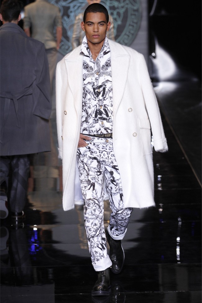 The Versace School of Style–Using the catwalk as a playful arena, Donatella Versace followed up a gladiator inspired spring season with a collection that amplifies the eccentricities to a new level. For the season’s bread and butter, suiting is interjected with great volume and outerwear is the leading counterpart to skimpy undergarments. Taking a sartorial page from the beloved gangster era, the suit represented a classic nod to menswear, ready to be deconstructed. Dressed in stripes, house prints and decorated to the point of no return, it was not a simple feat. Throwing in denim adorned with logos, the clean coat or shirt seemed far in between. Rounding out a great deal of extremities, Versace made a memorable finale with crisp white and a daring splash of lace.