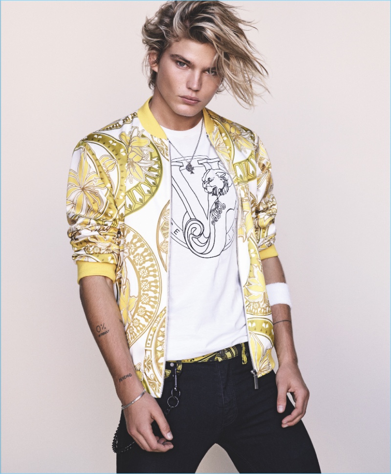 PinJordan Barrett rocks a hoodie and joggers for Versace Jeans’ spring-summer 2017 lookbook.PinAustralian model Jordan Barrrett wears a yellow printed bomber jacket for Versace Jeans’ spring-summer 2017 lookbook.PinA shirtless Jordan Barrett joins Lexi Boling for Versace Jeans’ spring-summer 2017 lookbook.PinAppearing in Versace Jeans’ spring-summer 2017 lookbook, Jordan Barrett wears a leather bomber jacket with printed jeans.