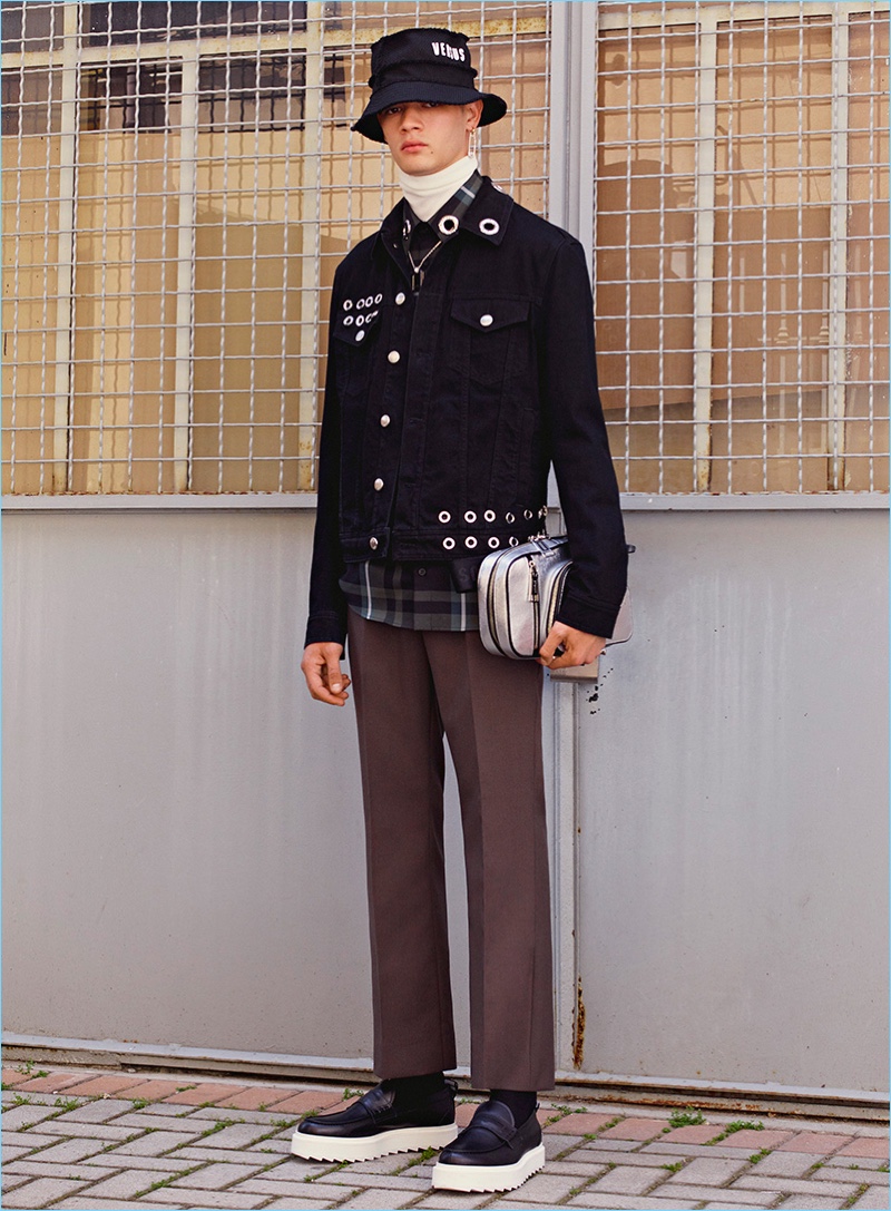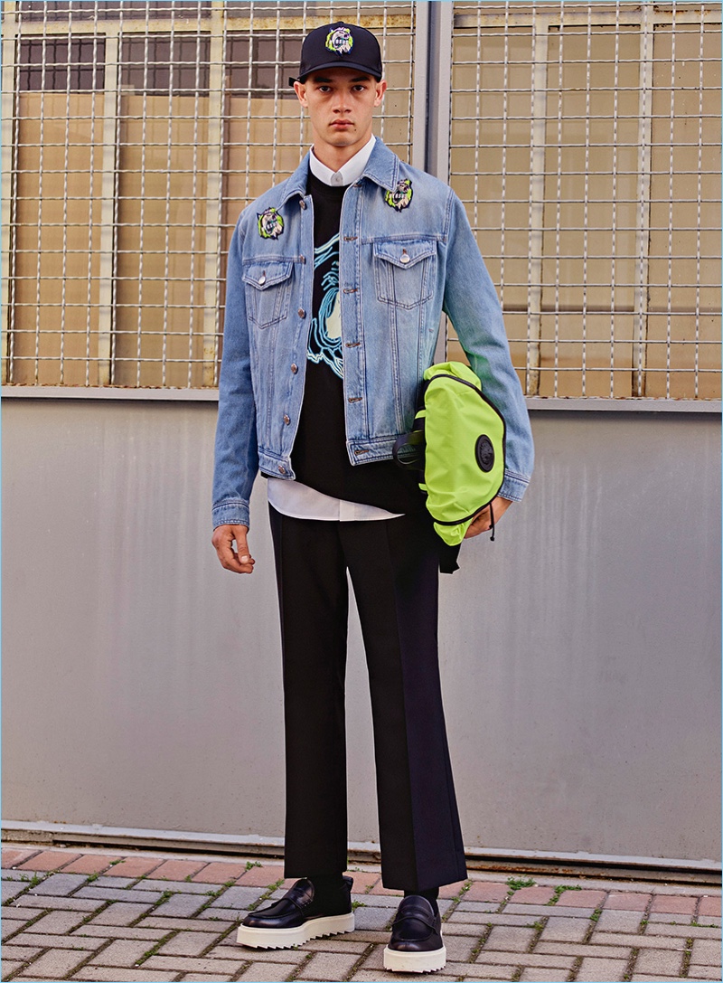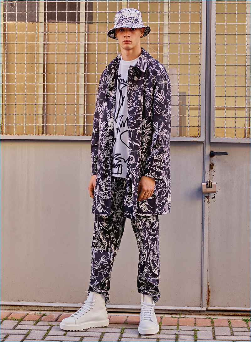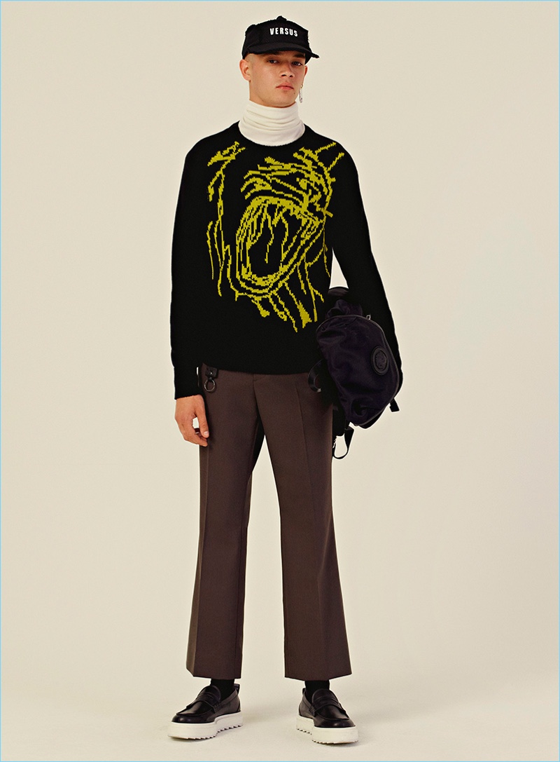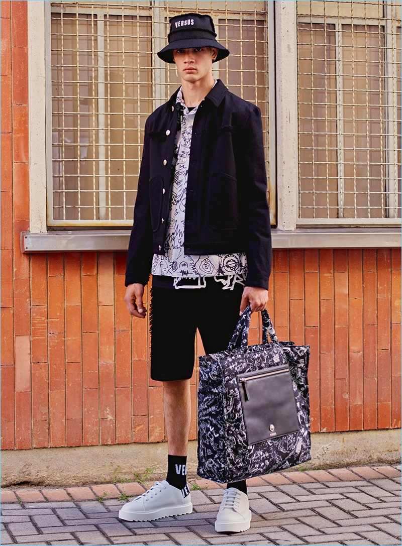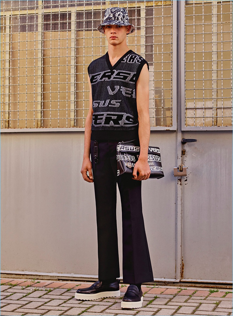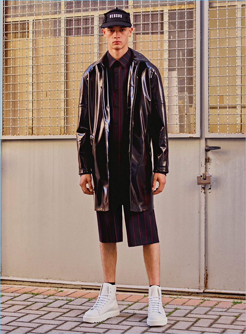 A collision of styles results in Versus Versace’s resort 2018 collection. The Italian fashion brand continues to embrace a young spirit with a playful mix of aesthetics. Front and center, the Versus man is perfectly fine pairing a pinstripe suit with a graphic tee and bucket hat. Meanwhile, hero pieces easily stand out with graphic statements. Versus delivers a bold plaid coat as well as streetwear-inspired clothing and accessories, which are covered in loud prints. Grommet details, cropped trousers, and denim staples also contribute to the lineup.