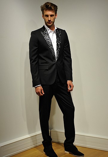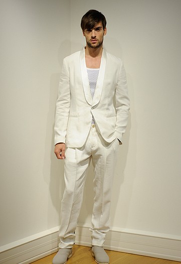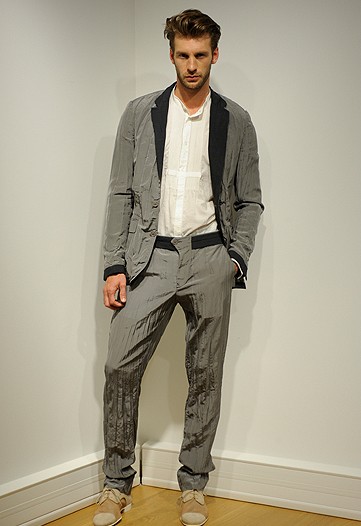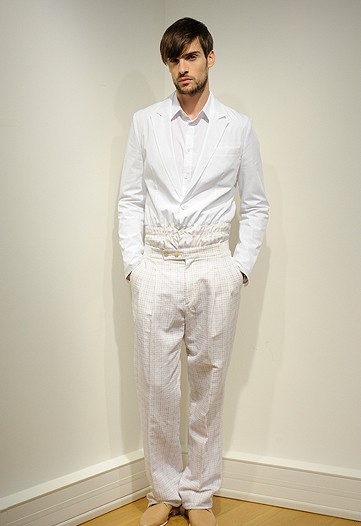 Typically structured and very conscious about construction, silhouette and quality when it comes to suiting in menswear, this season, Viktor & Rolf take the less traveled approach, settling for a suit that is more broken down and effortless in nature. Relaxed, pre-wrinkled fabrics act as the collection’s canvas as Viktor & Rolf take a low-brow stab at the traditional suit-leaving room for a soft silhouette that seamlessly flows from one hem to the next-as any spring piece should.